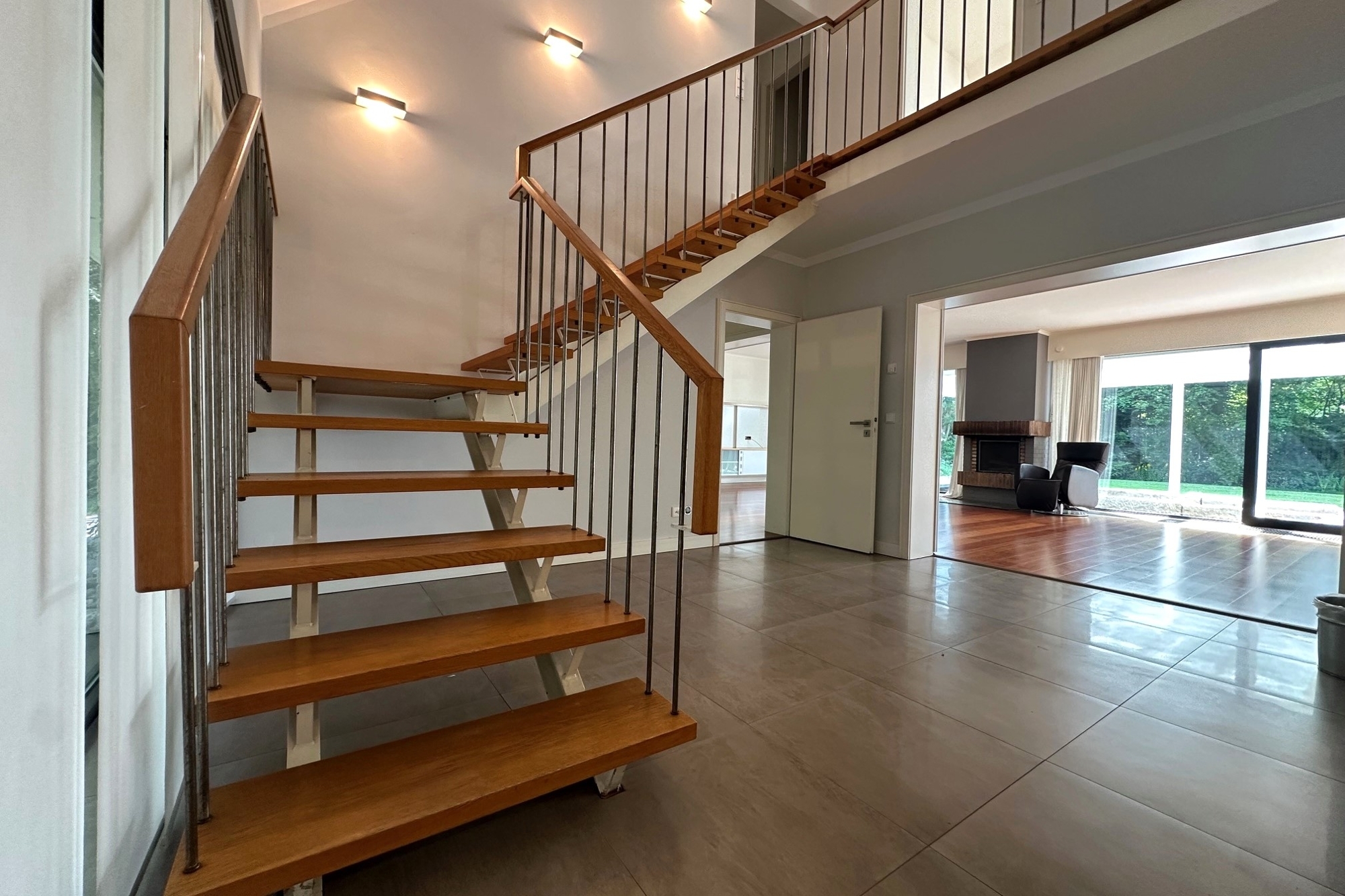Vom einladenden Eingangsbereich mit Windfang und innenliegendem Gäste-WC gelangen Sie in eine beeindruckende, offene Diele mit moderner Holztreppe. Diese bietet Zugang zu einer Garderobe, einem Musikzimmer und einem eindrucksvollen, ca. 50 m² großen Wohnbereich mit Panoramafenstern sowie angrenzendem Esszimmer.