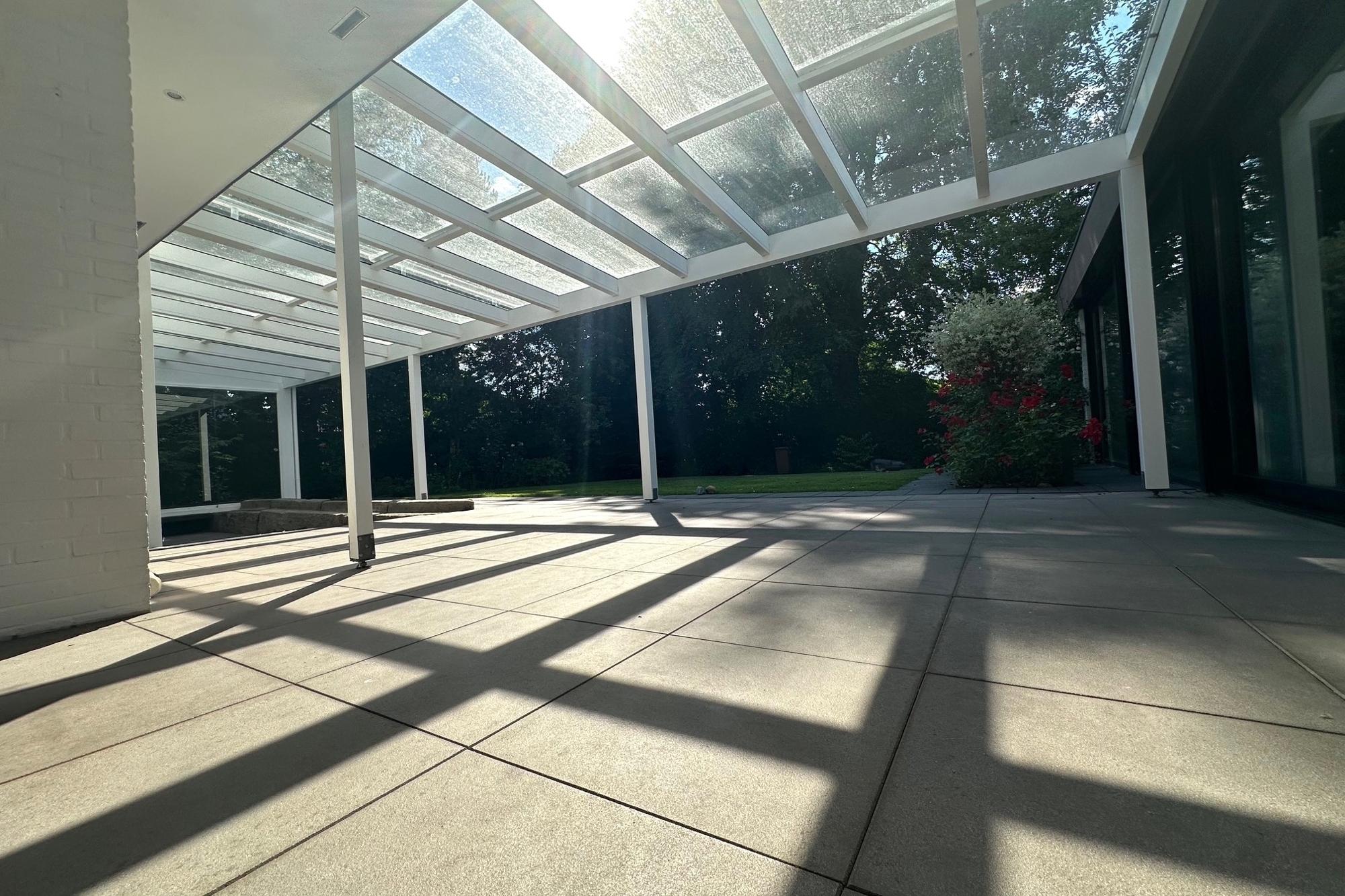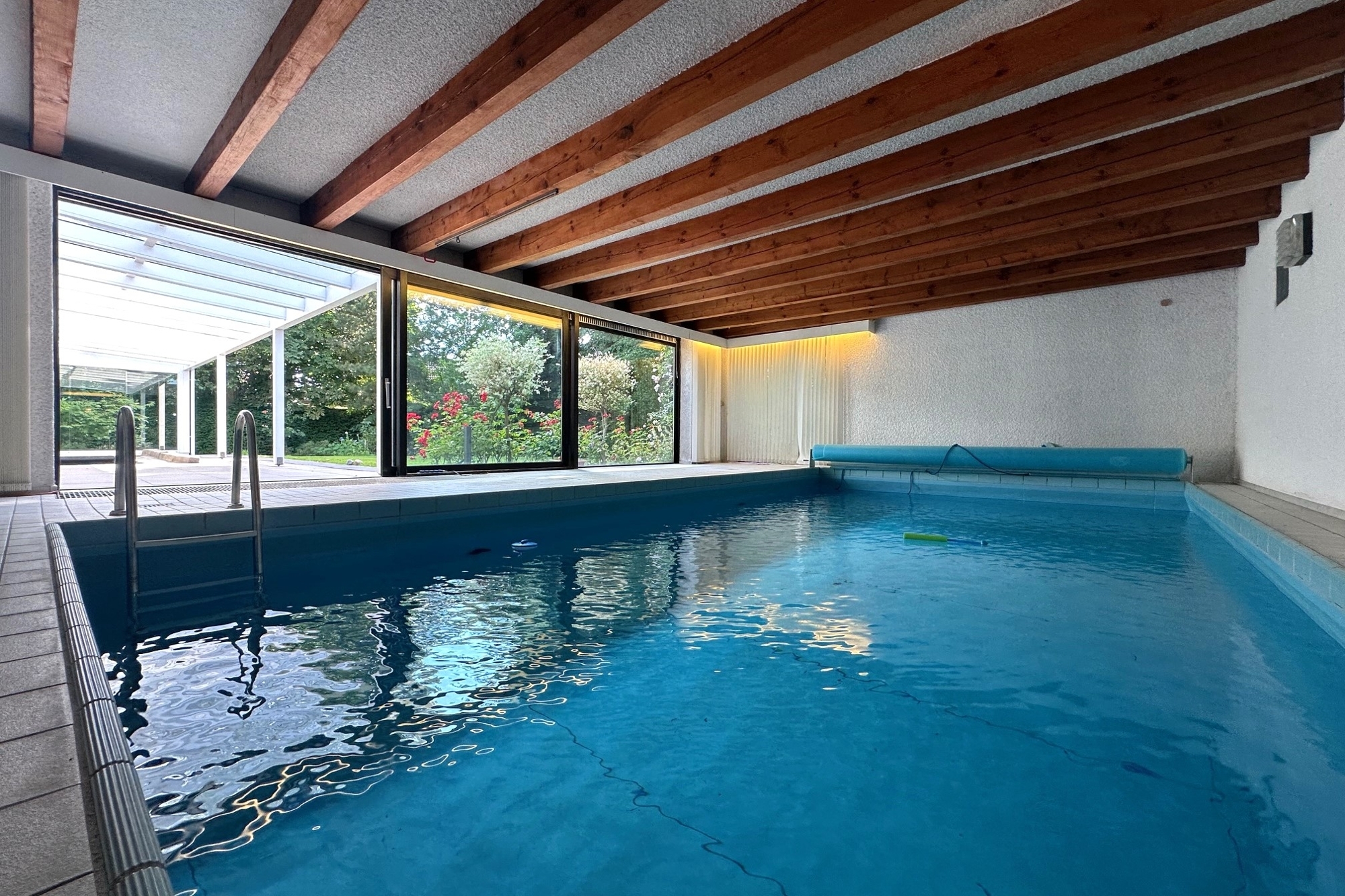Sowohl vom Wohn- und Essbereich, der offenen Küche als auch dem Poolbereich haben Sie einen wunderbaren Blick auf den herrlich eingewachsenen Garten mit einer großflächig überdachten Terrasse inklusive elektrischer Beschattung.