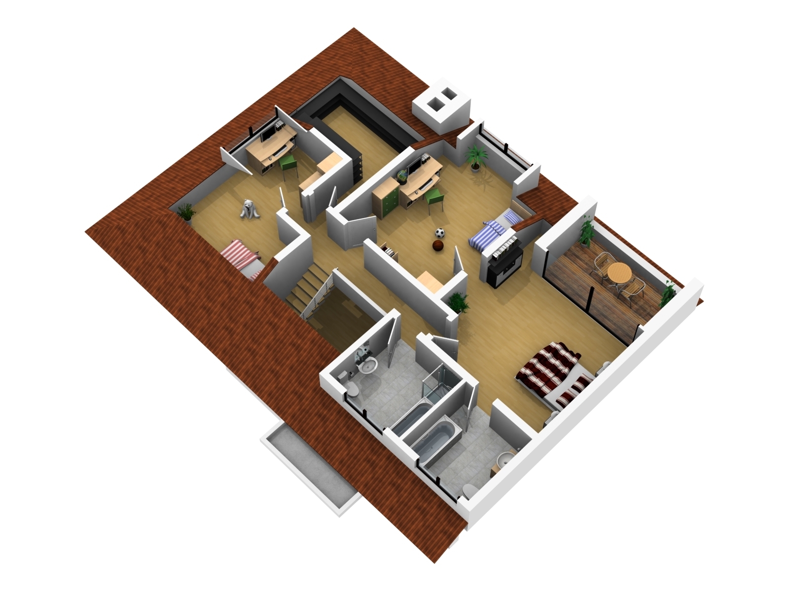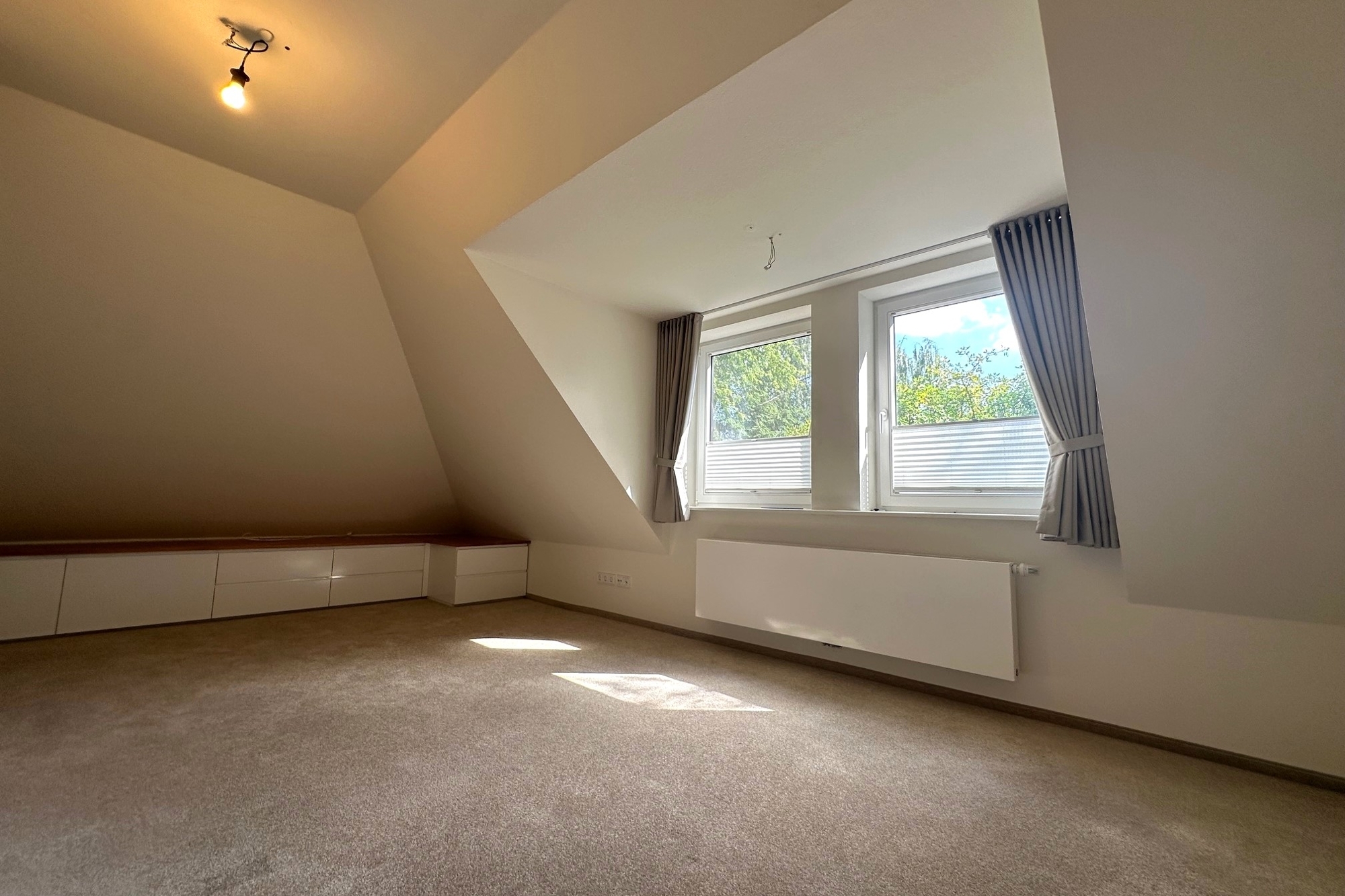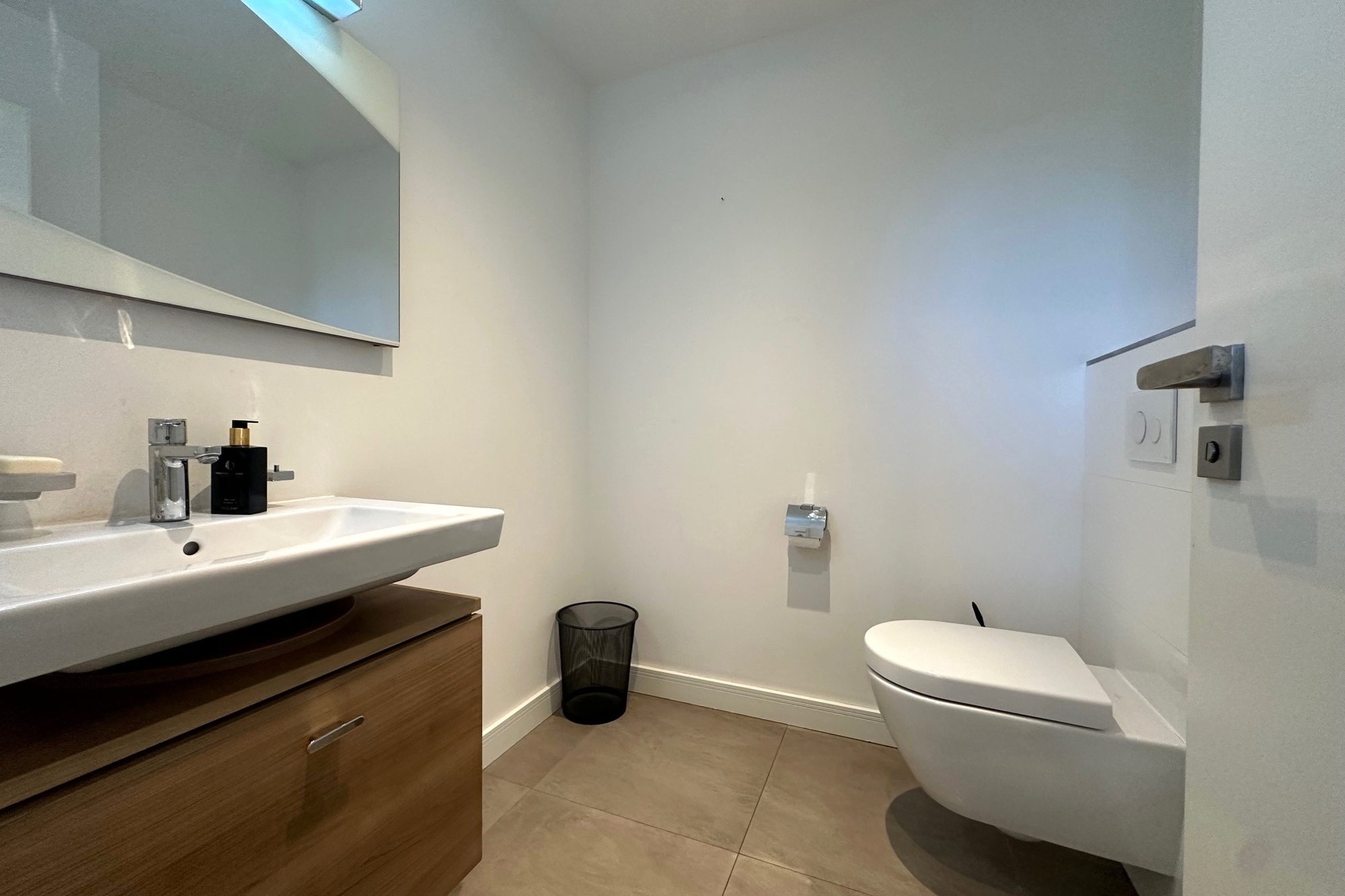 Über die offen gestaltete Treppe gelangen Sie in das Obergeschoss. Der dortige Flur führt in die drei Schlafbereiche; eines mit Loggia und en suite Badezimmer, zwei weitere mit einem gemeinsamen, nebenliegendem Ankleideraum und weiterem Badezimmer.