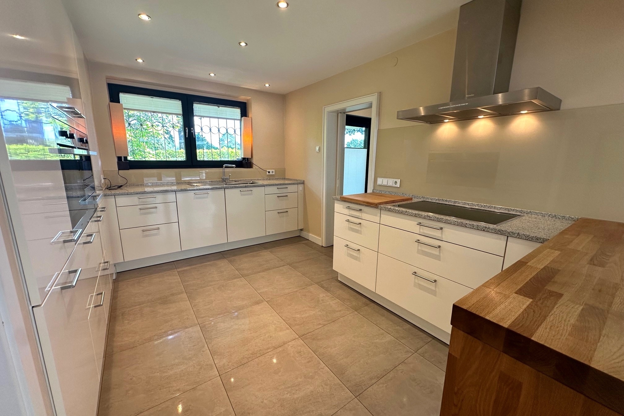 Direkt daneben finden Sie ein mögliches Bürozimmer mit angegliedertem Sauna-, Wellness- und Poolbereich, ein wahres Highlight dieses Anwesens. Rechts vom Windfang befindet sich die hochwertige Einbauküche und der daneben liegende Hauswirtschaftsraum sowie eine Vorratskammer.