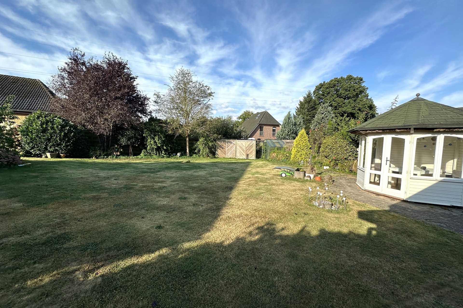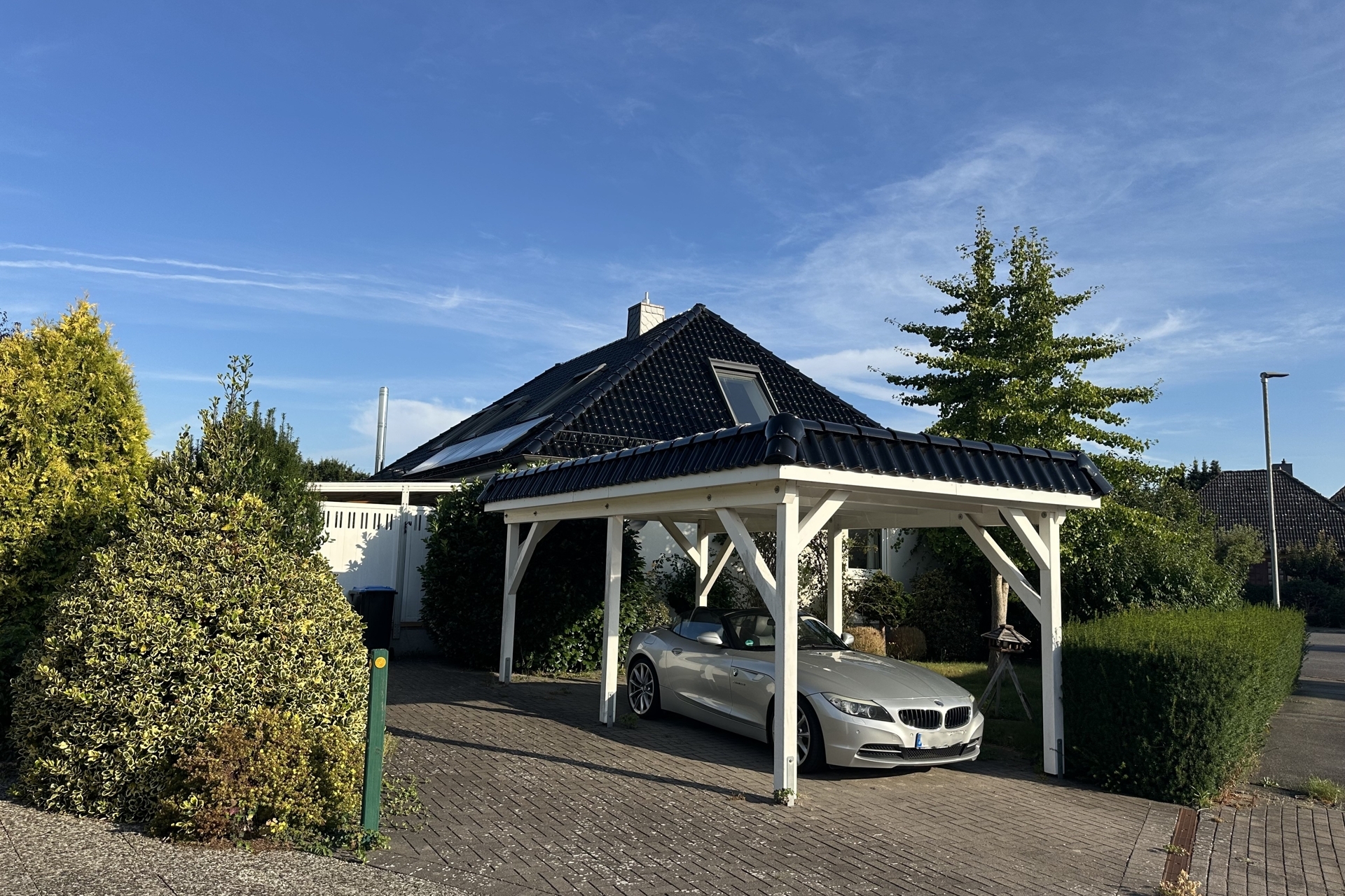 Zum Außenbereich gehören ein gepflegter Garten mit Pavillon sowie eine Garage und ein Carport, die ausreichend Platz für Fahrzeuge und Fahrräder bieten.