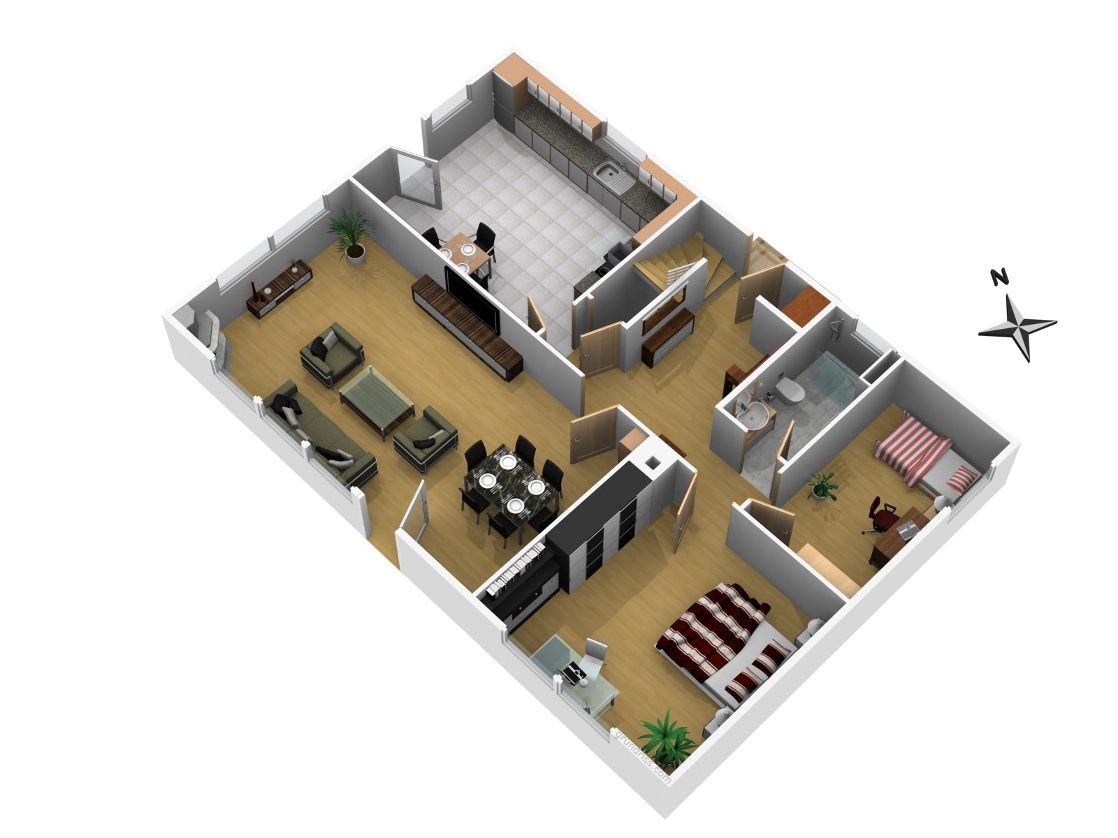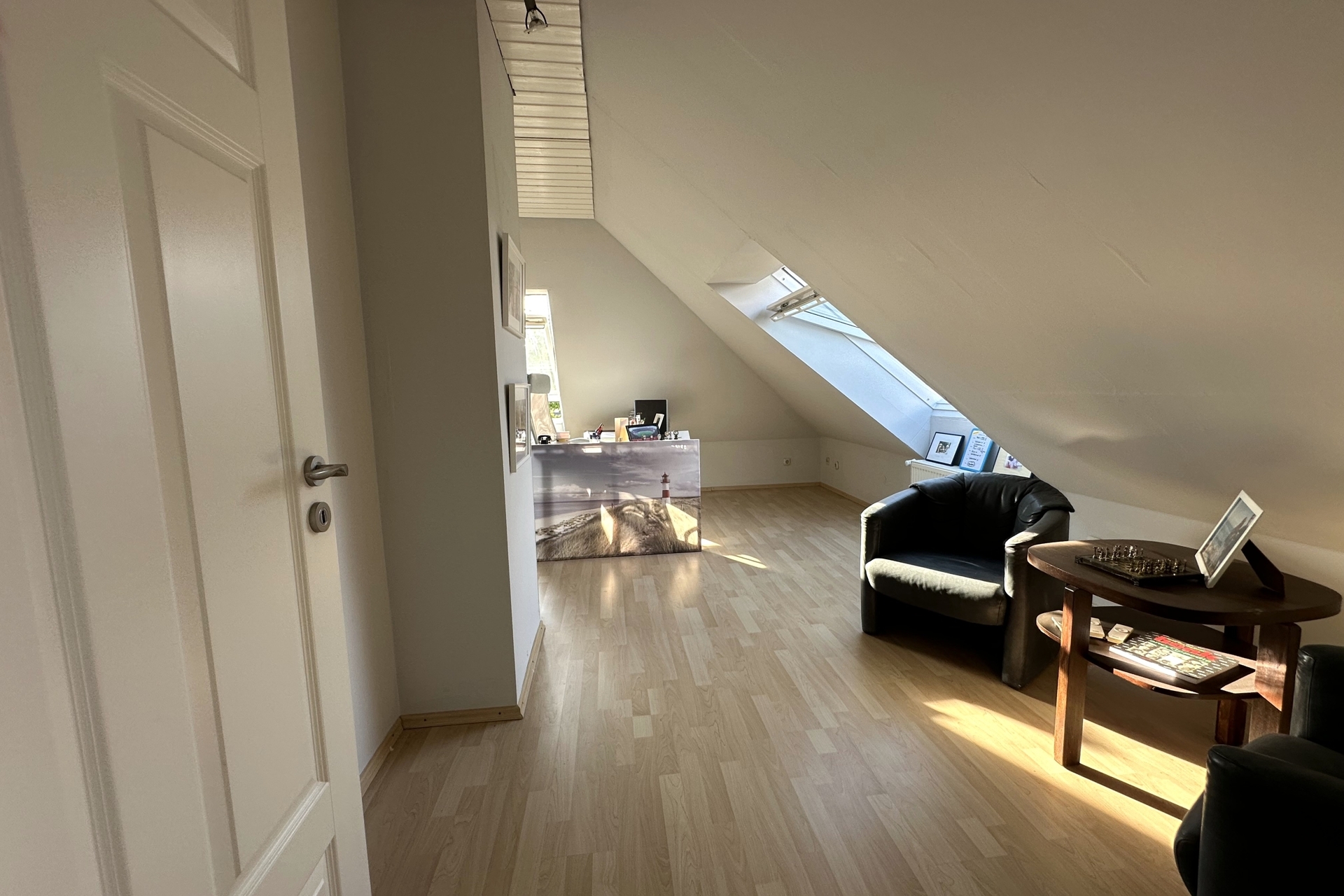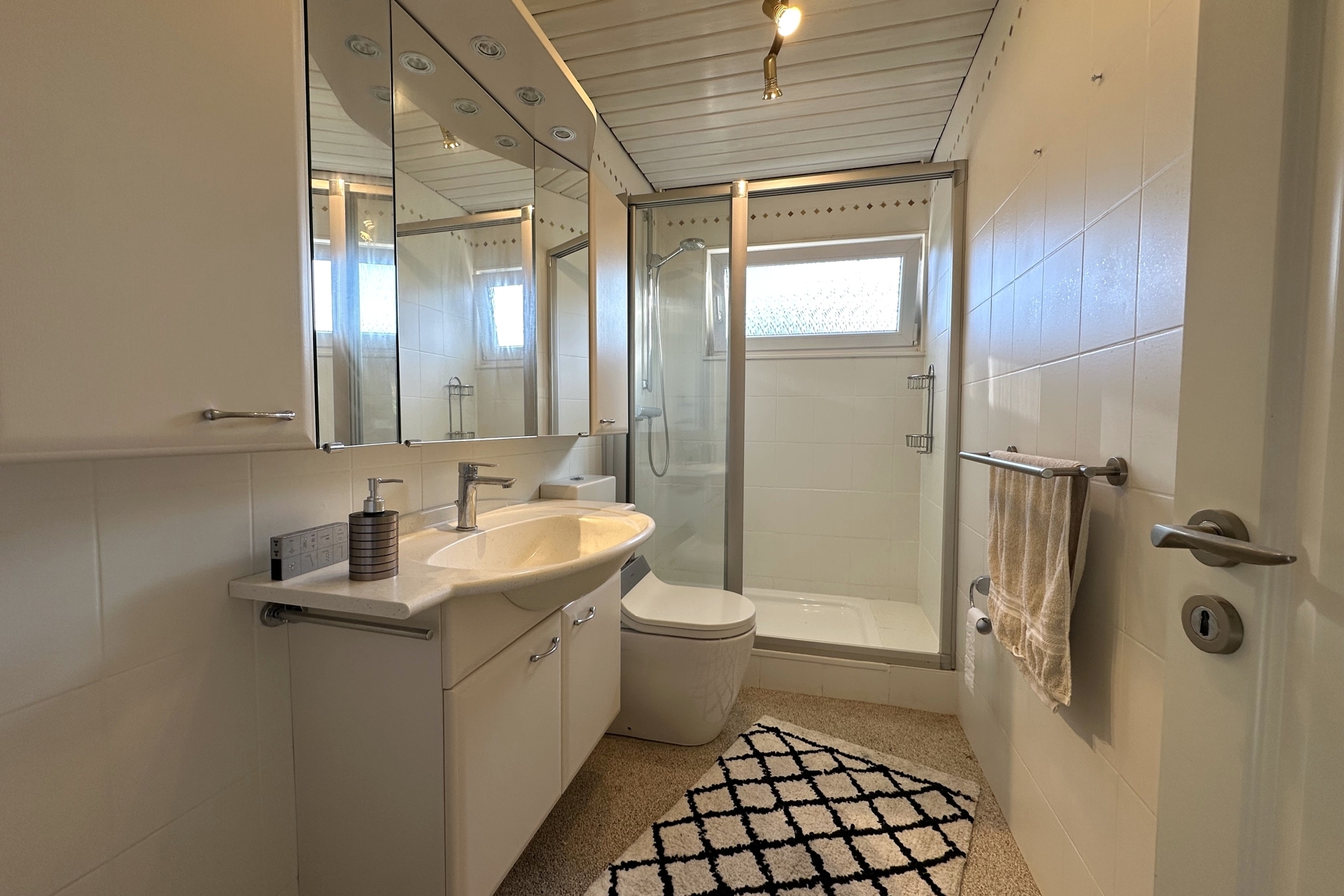 Die Aufteilung: Im Erdgeschoss befindet sich der großzügige Wohn- und Essbereich mit Kamin und sonniger Südwest-Terrasse, die Küche sowie zwei Zimmer und das Duschbad mit Fußbodenheizung. Im Obergeschoss befinden sich zwei weitere Zimmer sowie das Vollbad.