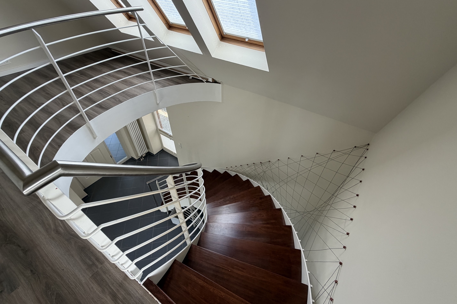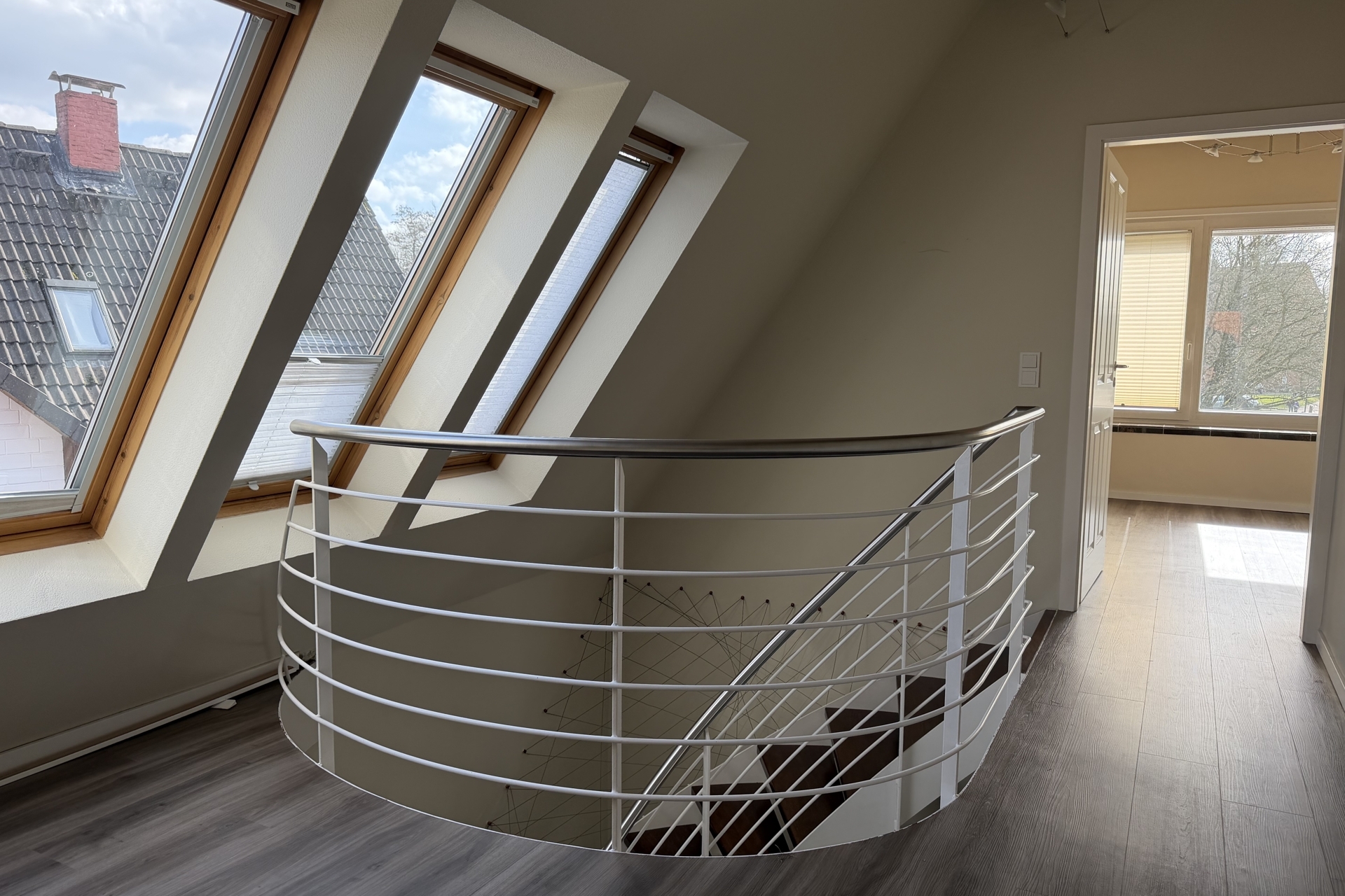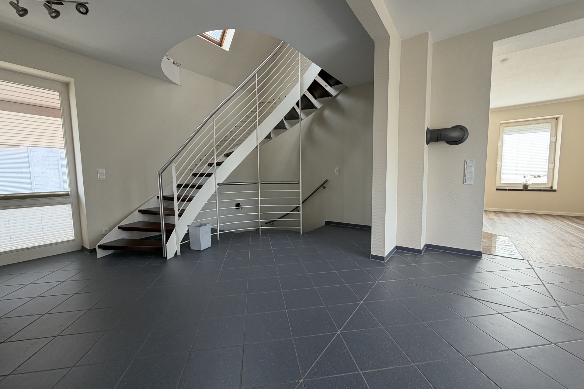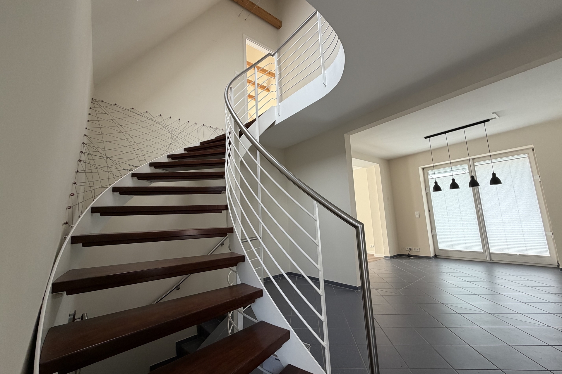 Der lichtdurchflutete Wohnbereich mit Decken bis in die Dachspitze schafft ein eindrucksvolles Raumgefühl und verleiht dem Haus seine besondere Atmosphäre. Die offene Gestaltung wird durch eine elegante Galerie ergänzt, die den Wohnraum auf stilvolle Weise erweitert. Ein markantes Designelement ist die individuell gestaltete Treppe, die als architektonischer Blickfang das Interieur prägt.