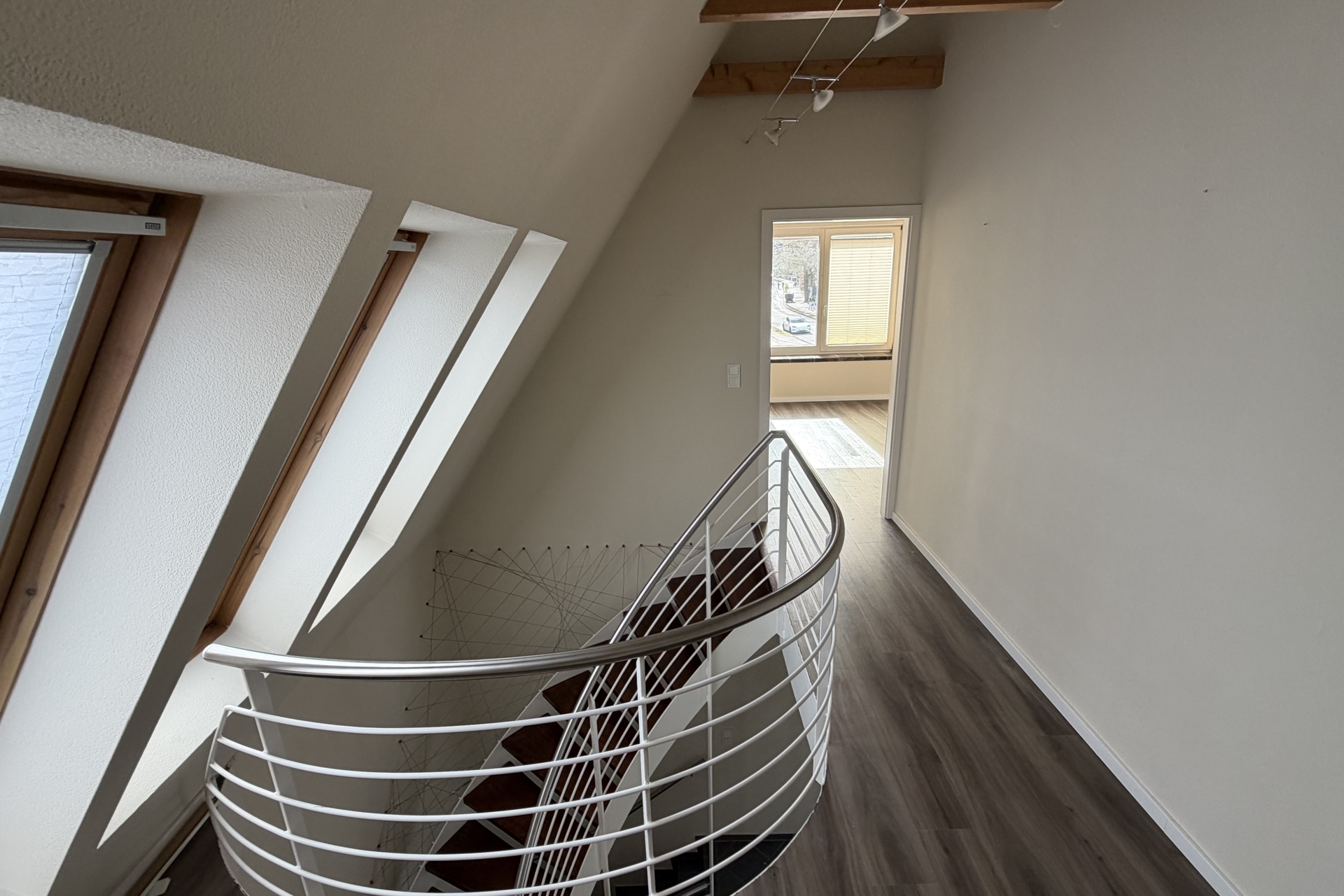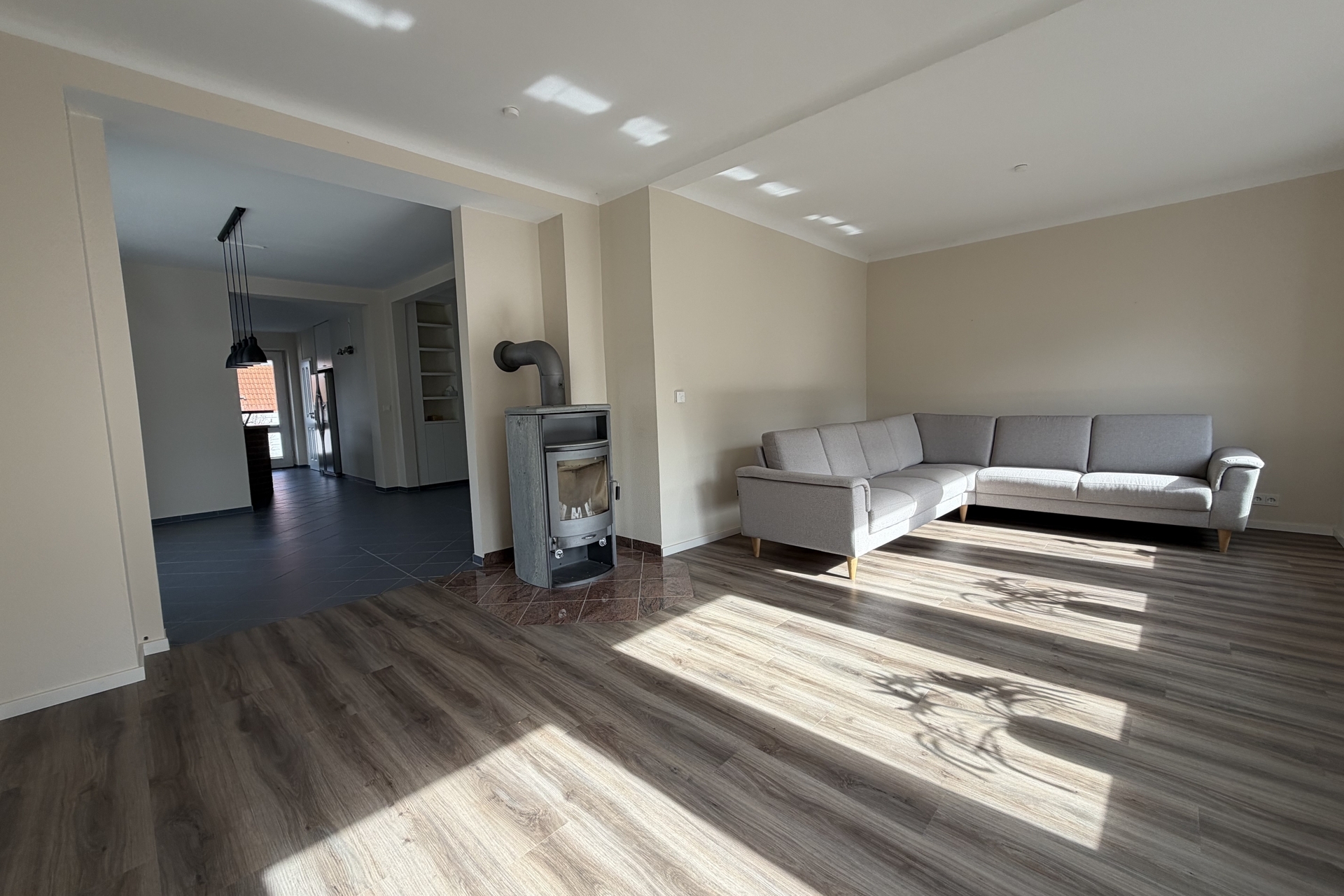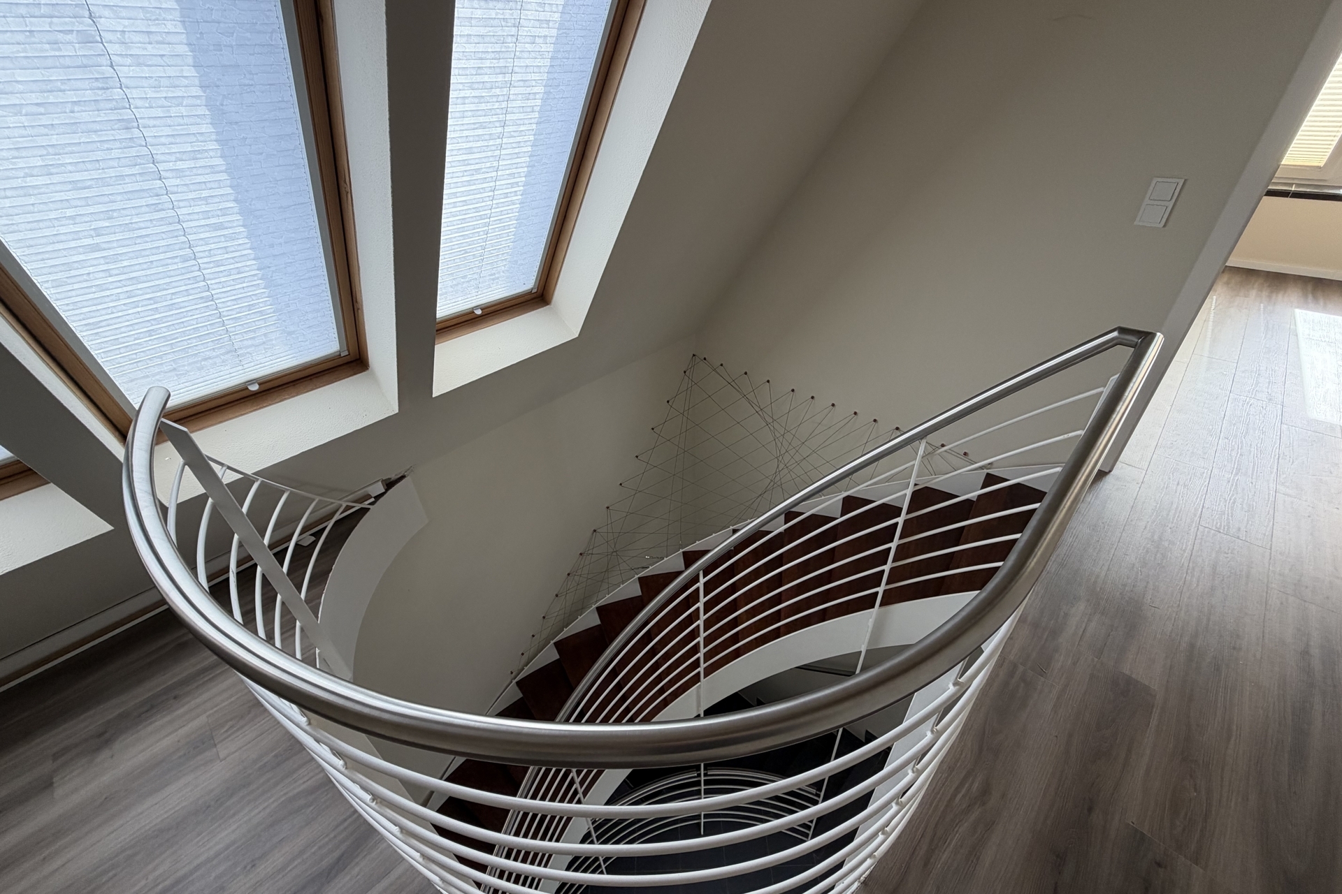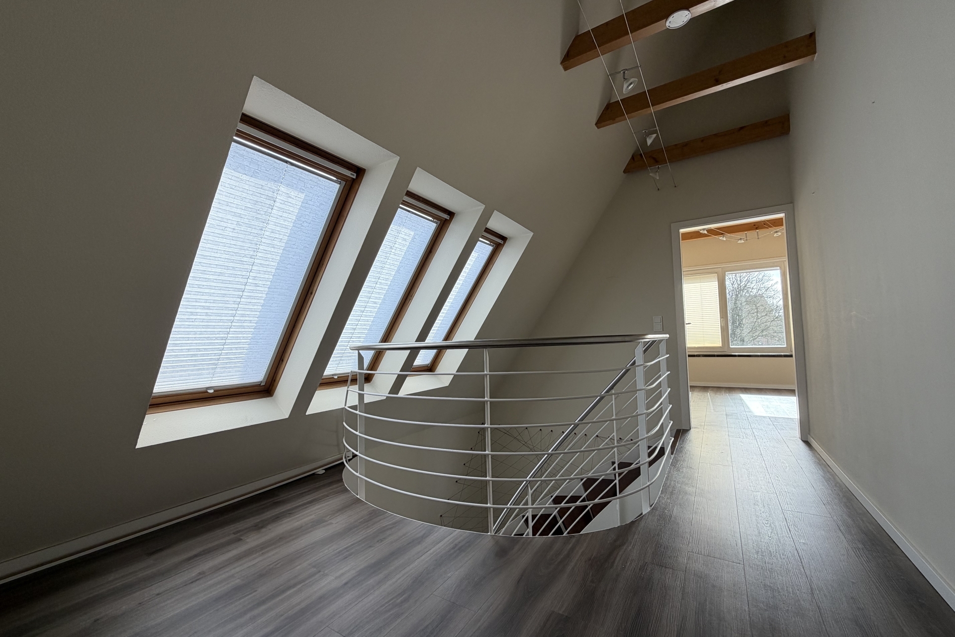 Der lichtdurchflutete Wohnbereich mit Decken bis in die Dachspitze schafft ein eindrucksvolles Raumgefühl und verleiht dem Haus seine besondere Atmosphäre. Die offene Gestaltung wird durch eine elegante Galerie ergänzt, die den Wohnraum auf stilvolle Weise erweitert. Ein markantes Designelement ist die individuell gestaltete Treppe, die als architektonischer Blickfang das Interieur prägt.