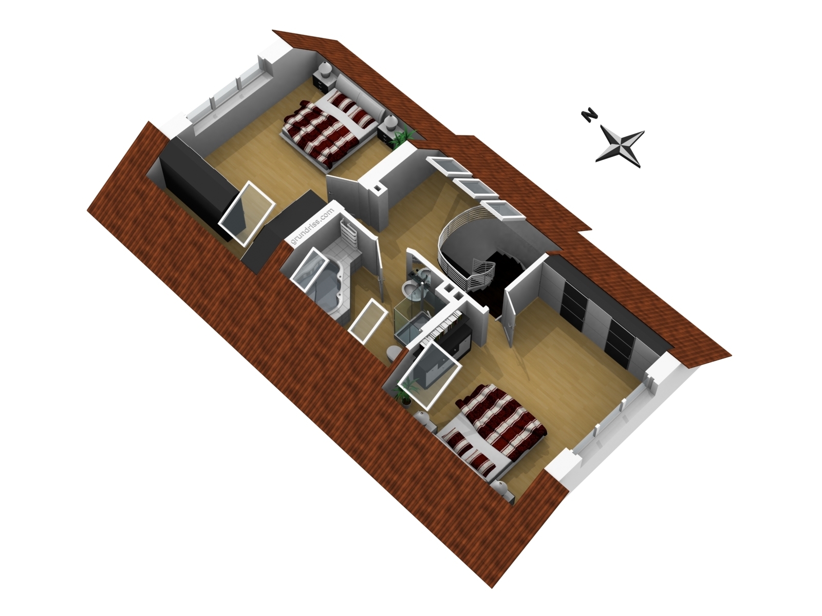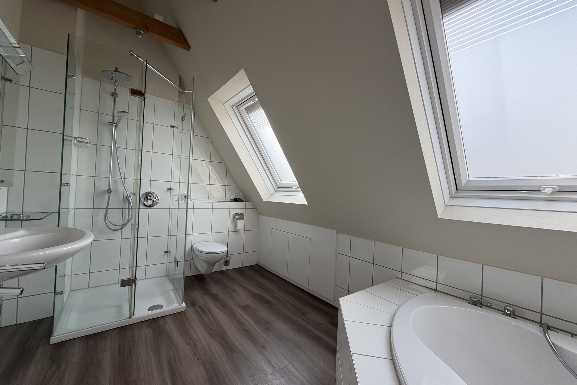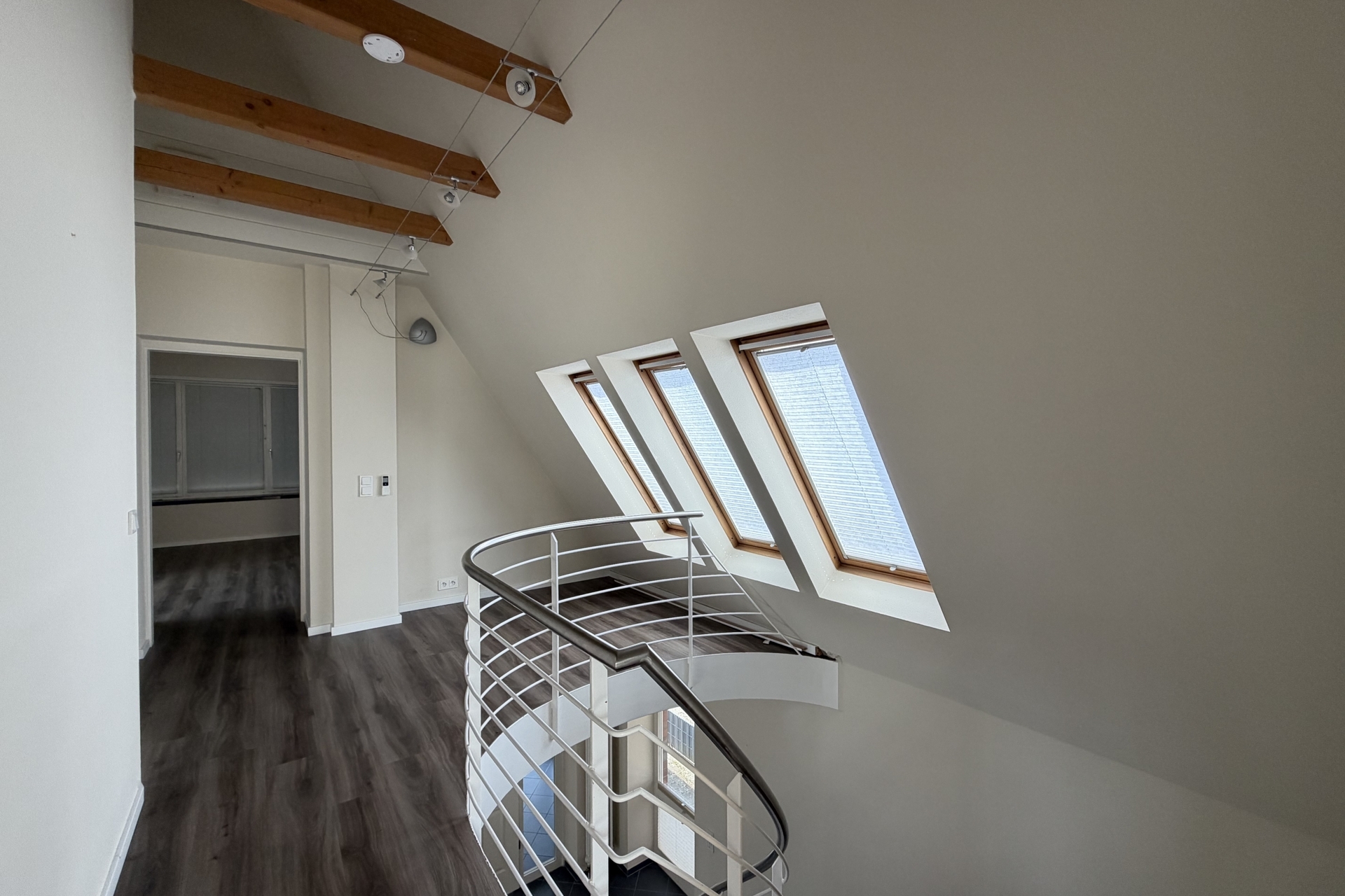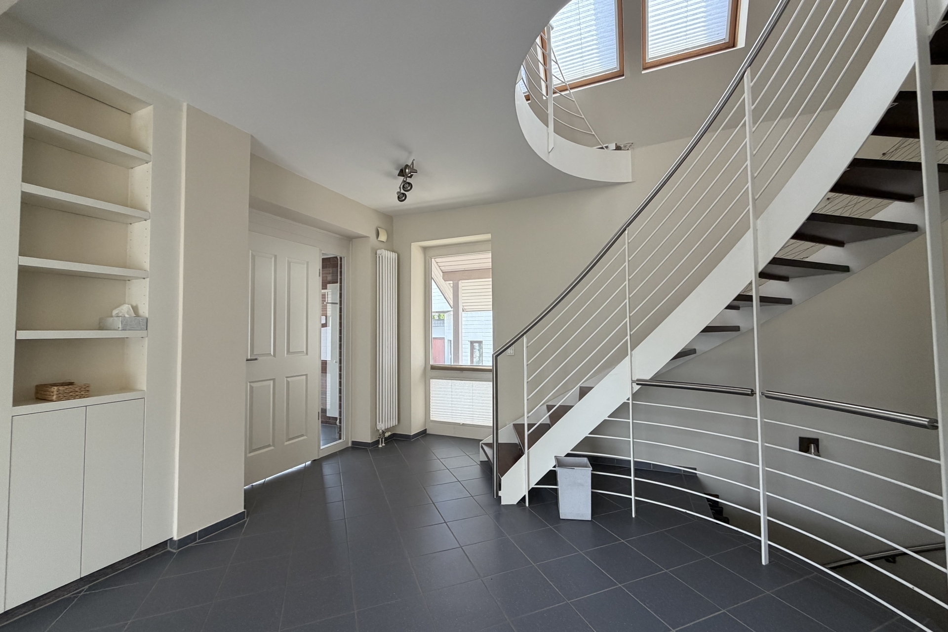 Der lichtdurchflutete Wohnbereich mit Decken bis in die Dachspitze schafft ein eindrucksvolles Raumgefühl und verleiht dem Haus seine besondere Atmosphäre. Die offene Gestaltung wird durch eine elegante Galerie ergänzt, die den Wohnraum auf stilvolle Weise erweitert. Ein markantes Designelement ist die individuell gestaltete Treppe, die als architektonischer Blickfang das Interieur prägt.