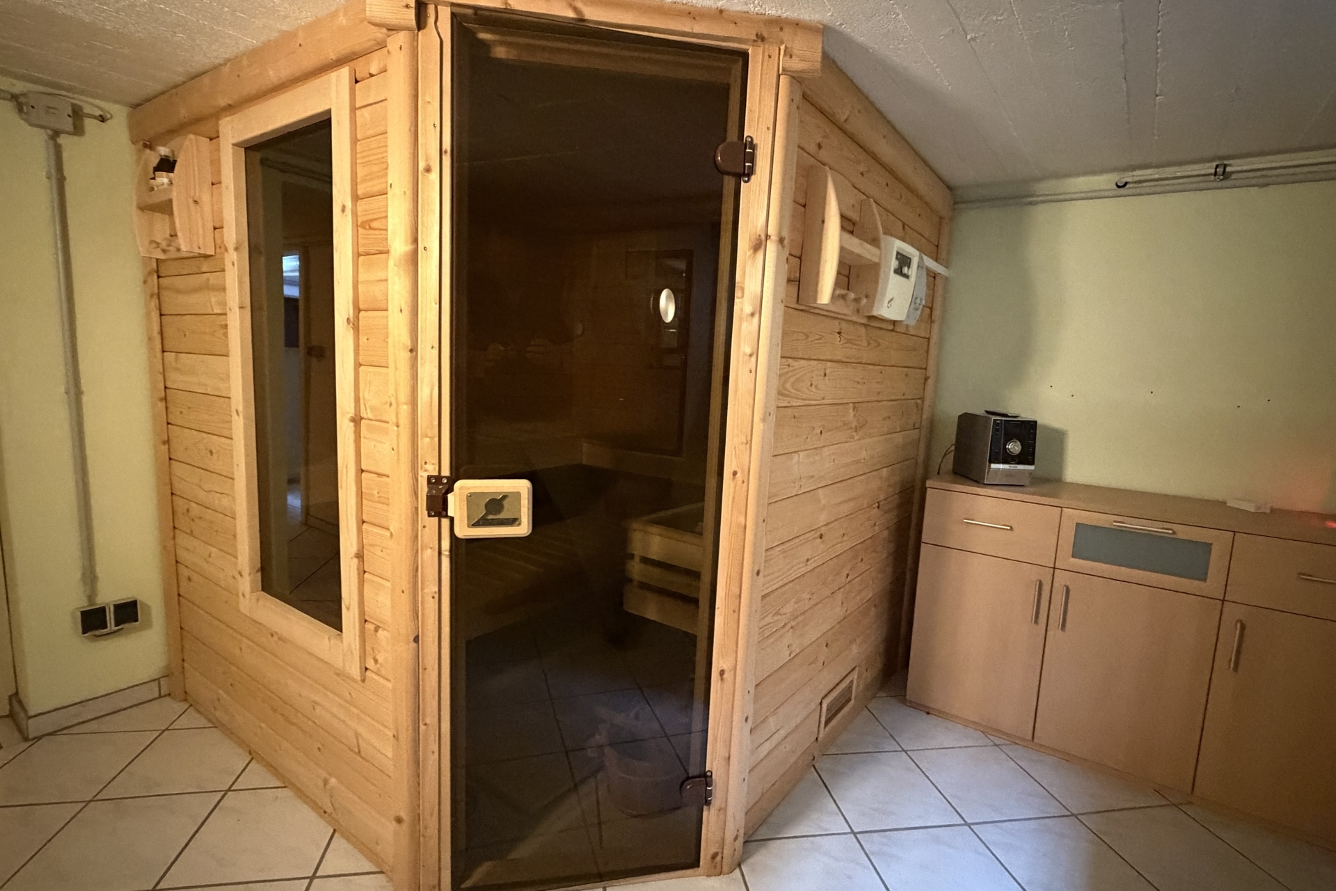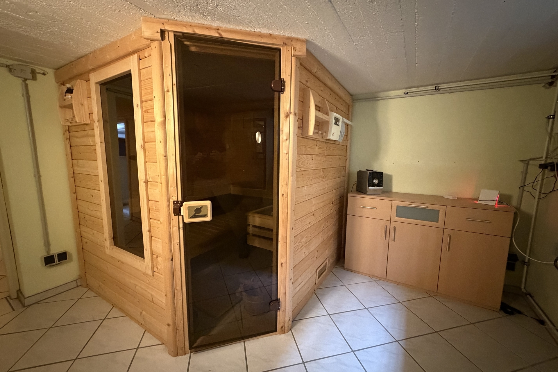 Im Kellergeschoss befindet sich eine Sauna, die das Angebot komfortabel ergänzt und Raum für entspannte Stunden bietet.