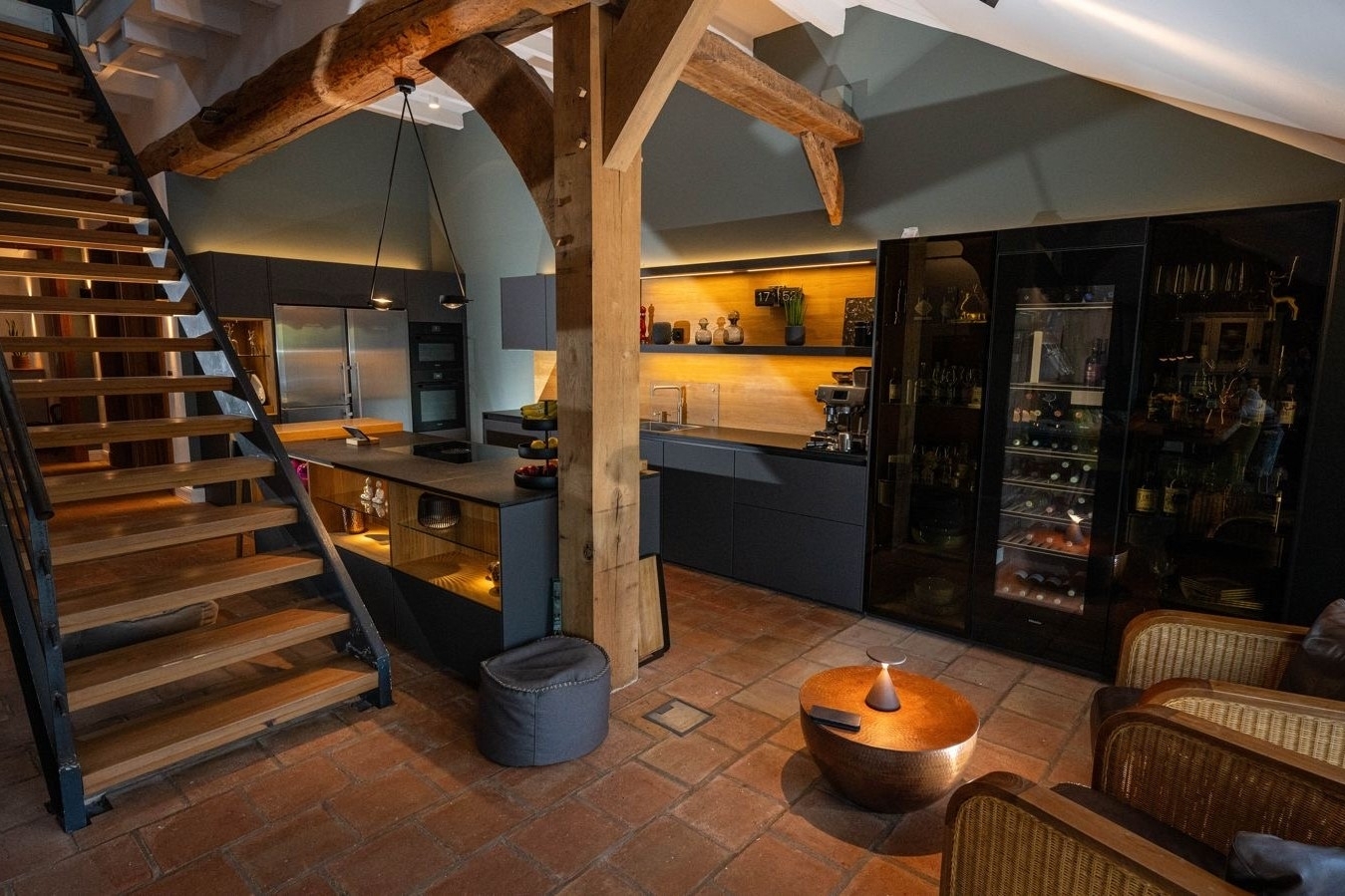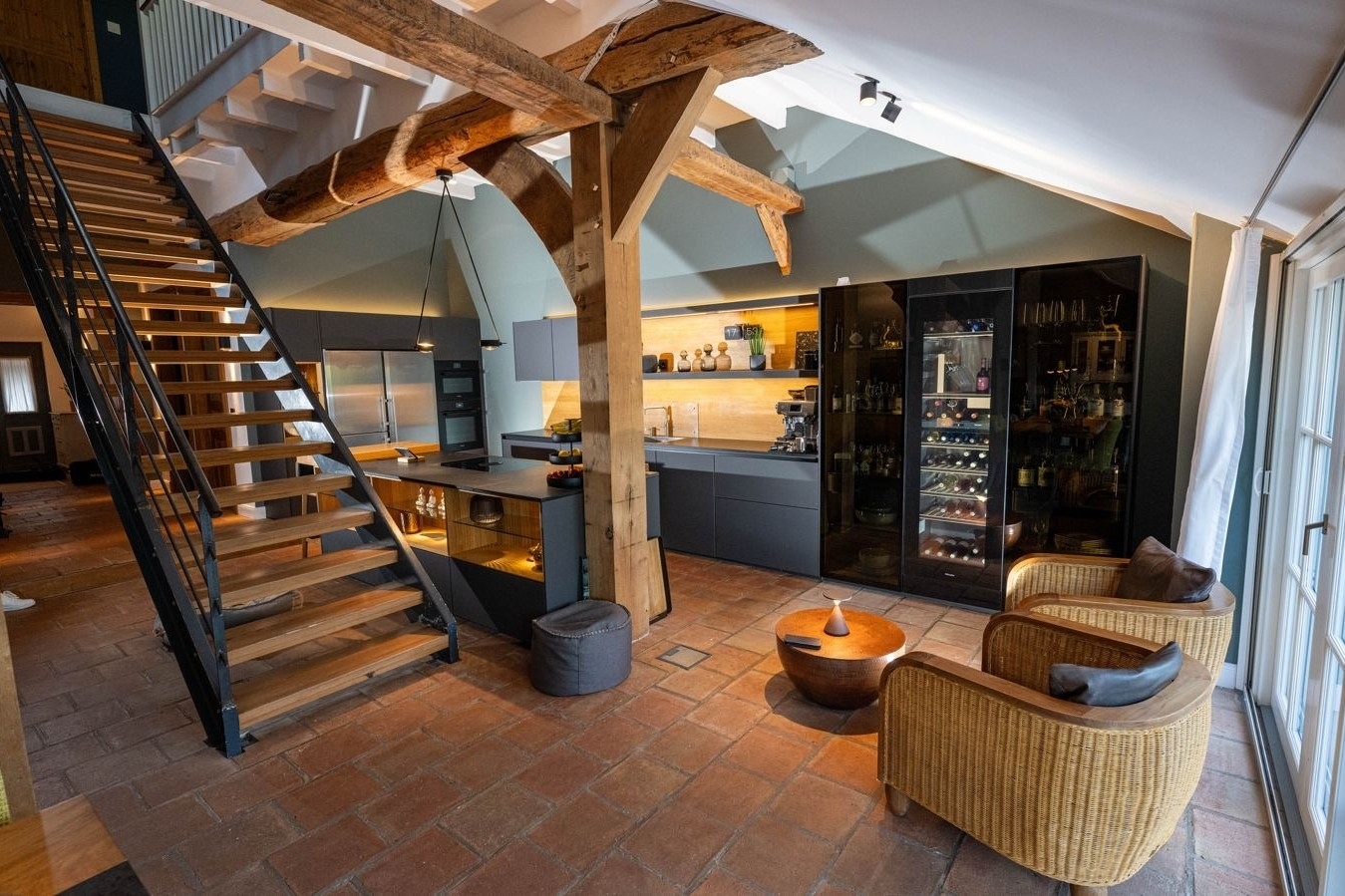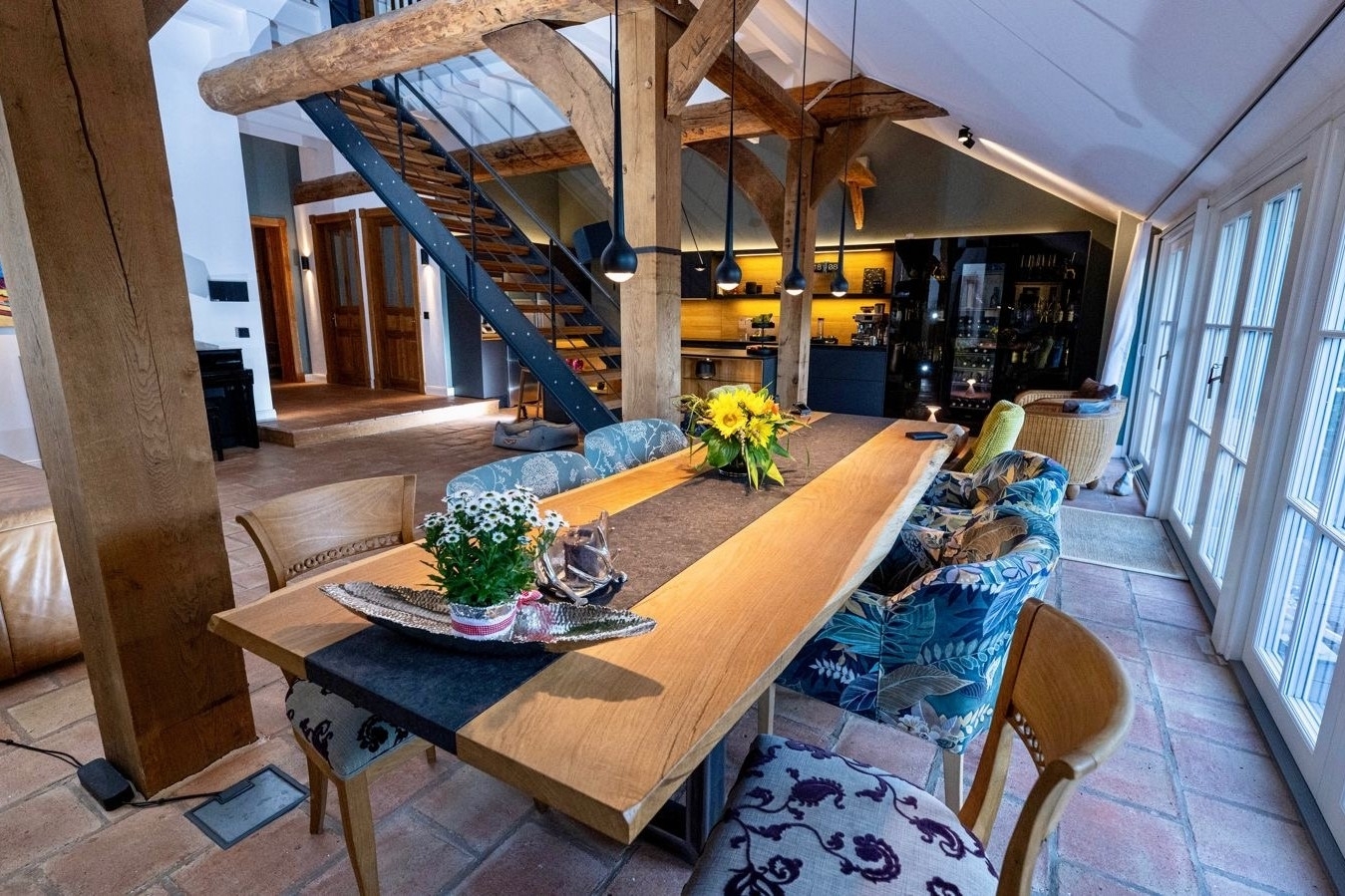 Das Herzstück des Hauses bildet der beeindruckende, über 67 m² große Wohn- und Essbereich. Eine Deckenhöhe von ca. 4,40 Metern verleiht dem Raum eine außergewöhnliche Großzügigkeit, während das Zusammenspiel aus historischen Holzbalken und moderner Innenarchitektur eine warme, zugleich elegante Atmosphäre schafft. Hier genießen Sie entspannte Stunden, empfangen Gäste an einem großzügigen Esstisch oder entfalten Ihre Kochleidenschaft in der offenen, hochwertig ausgestatteten Einbauküche von Team 7. Exklusive Designleuchten von Tobias Grau setzen dabei stilvolle Akzente und unterstreichen den gehobenen Anspruch des Interieurs.