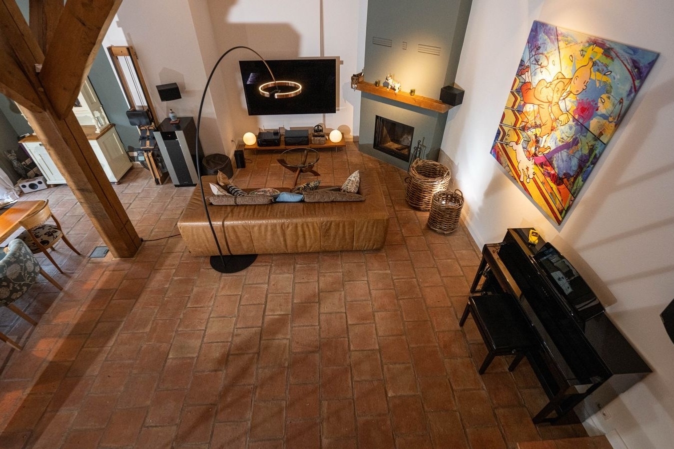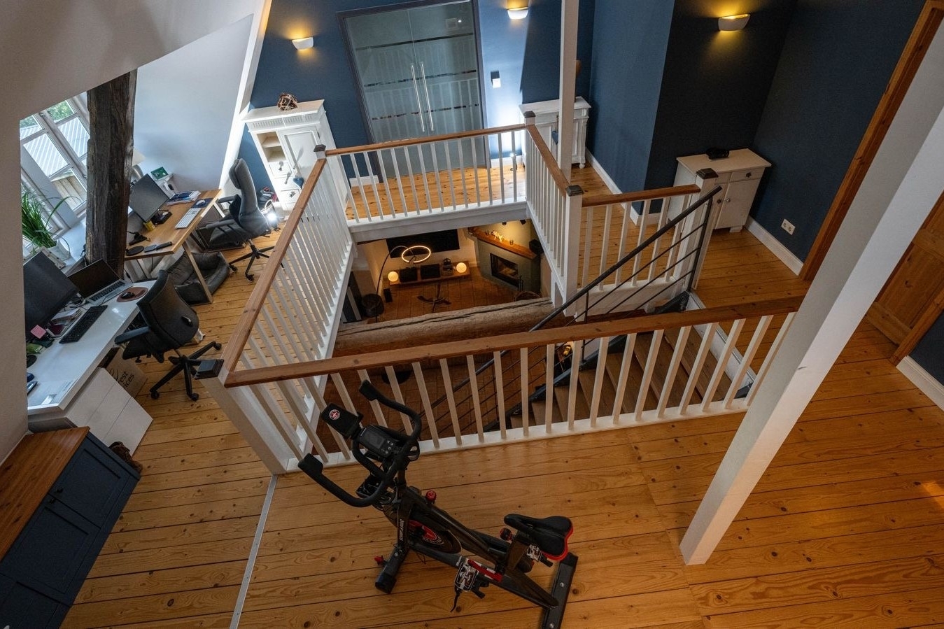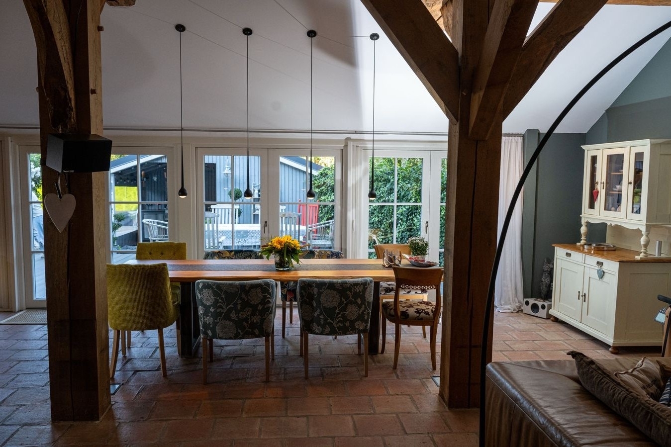 Das Herzstück des Hauses bildet der beeindruckende, über 67 m² große Wohn- und Essbereich. Eine Deckenhöhe von ca. 4,40 Metern verleiht dem Raum eine außergewöhnliche Großzügigkeit, während das Zusammenspiel aus historischen Holzbalken und moderner Innenarchitektur eine warme, zugleich elegante Atmosphäre schafft. Hier genießen Sie entspannte Stunden, empfangen Gäste an einem großzügigen Esstisch oder entfalten Ihre Kochleidenschaft in der offenen, hochwertig ausgestatteten Einbauküche von Team 7. Exklusive Designleuchten von Tobias Grau setzen dabei stilvolle Akzente und unterstreichen den gehobenen Anspruch des Interieurs.