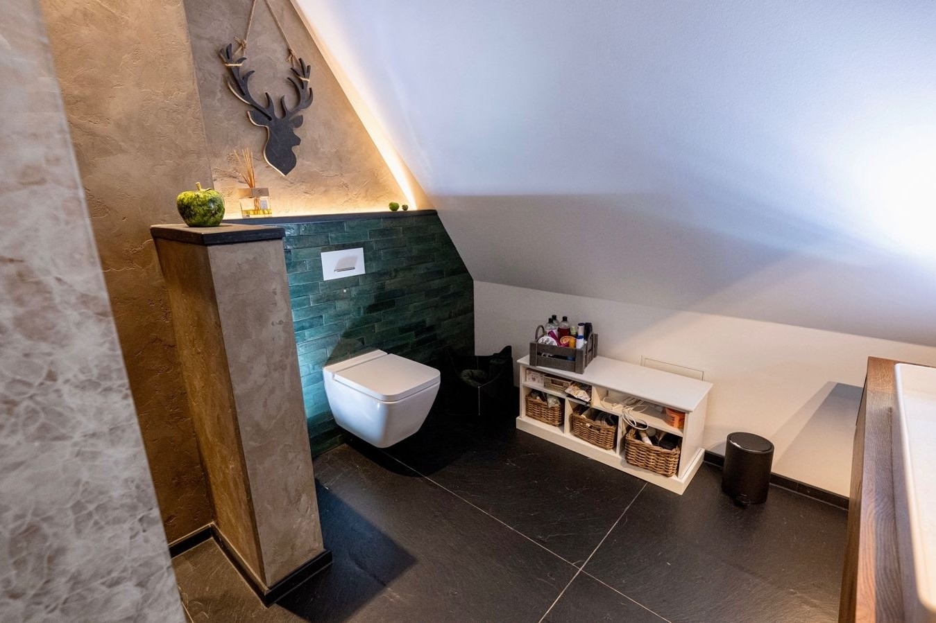 – modernes Duschbad (Schieferboden, Occhio-Beleuchtung)