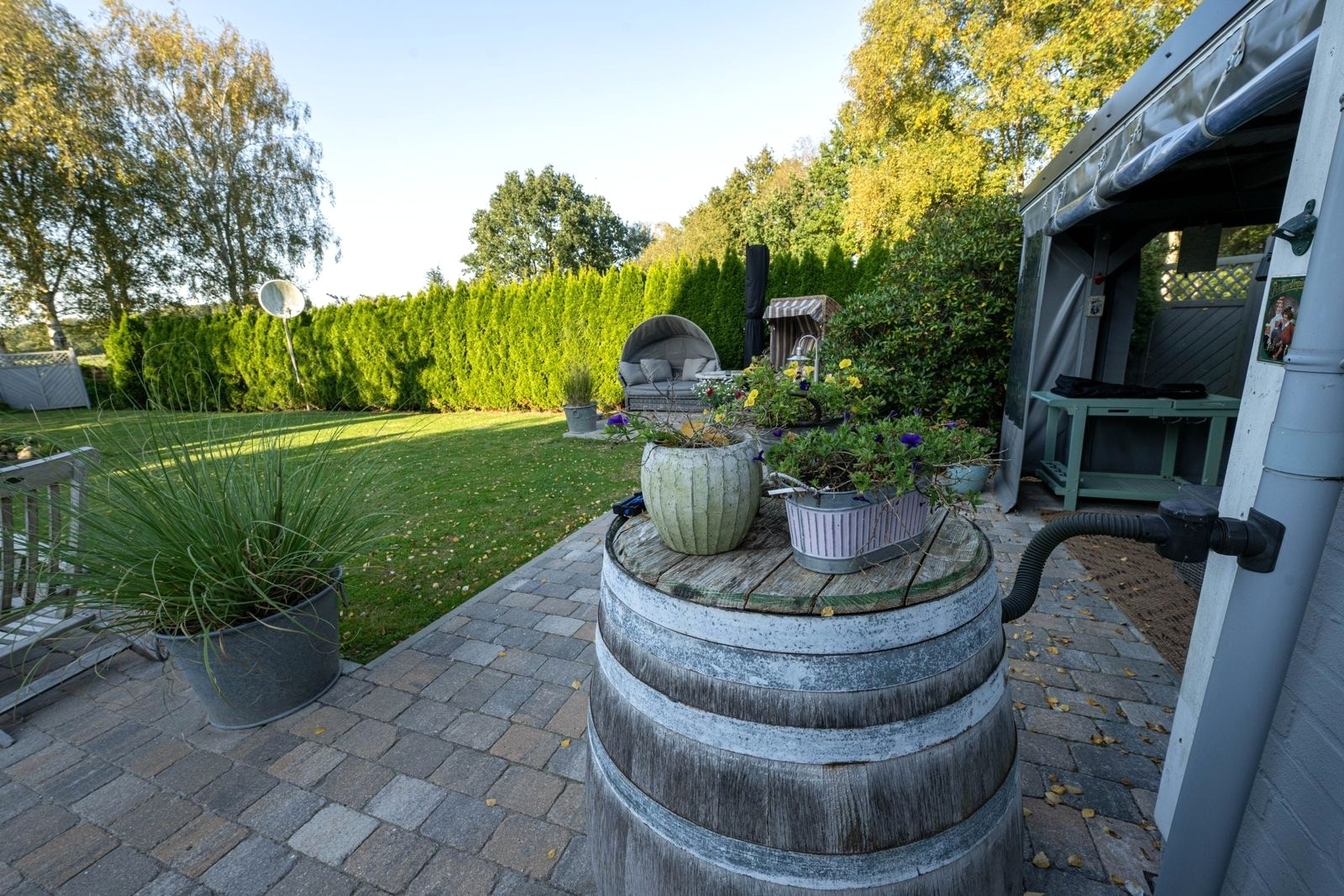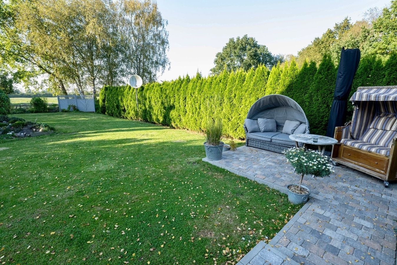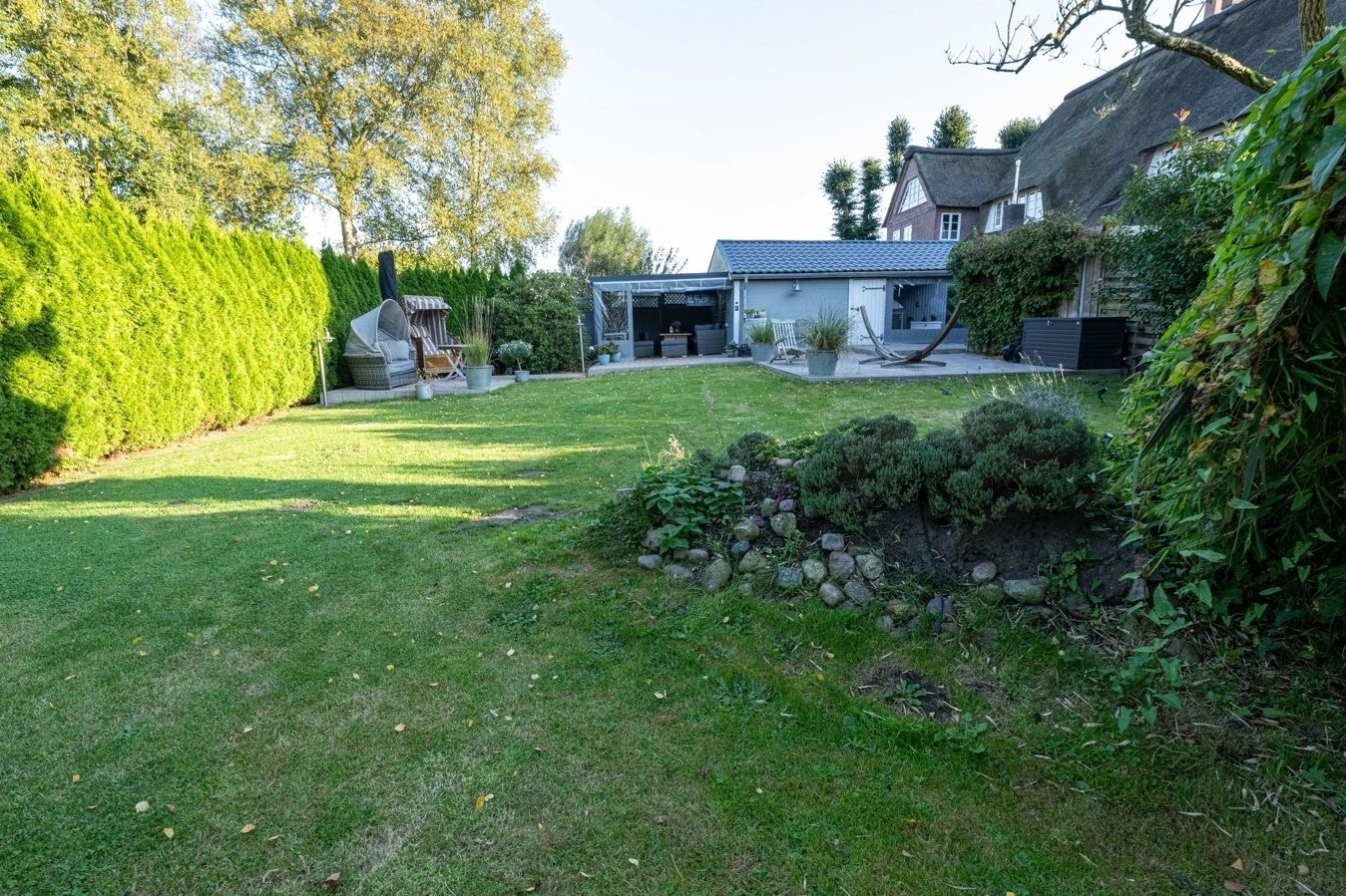 Auch der Außenbereich lässt keine Wünsche offen: Ein ca. 700 m² großer, liebevoll gestalteter Garten mit unverbaubtem Blick über die umliegenden Wiesen und Felder eröffnet Ihnen ein Höchstmaß an Privatsphäre und Naturverbundenheit. Die überdachte Außenküche von Napoleon, ein großzügiger Terrassenbereich sowie eine stimmungsvolle Gartenbeleuchtung laden zu geselligen Abenden und entspannten Stunden im Freien ein.