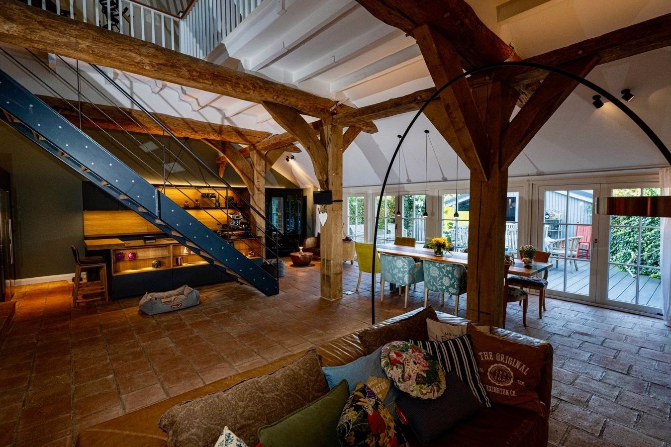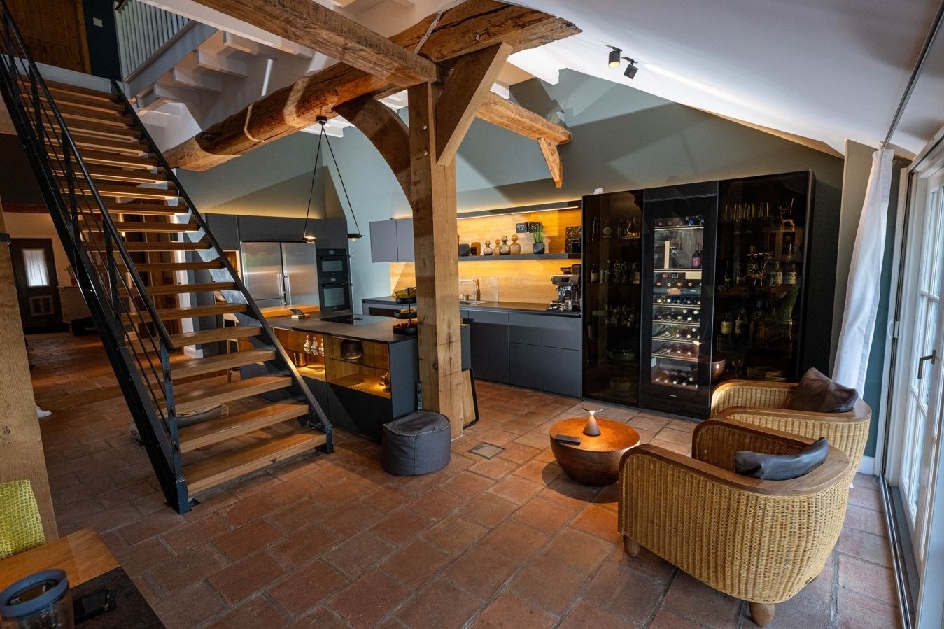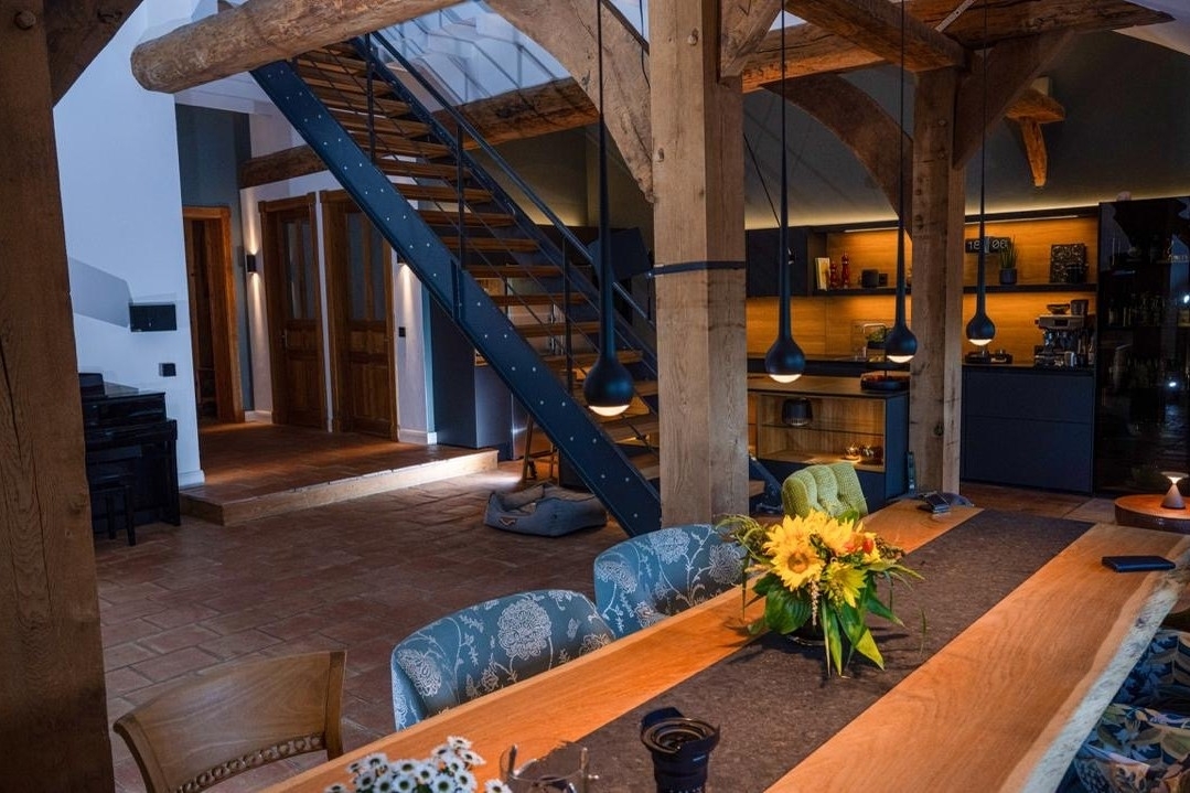 Ursprünglich Teil eines ehemaligen Kuhstalls, wurde die Immobilie mit großer Sorgfalt und Liebe zum Detail in ein exklusives Wohnhaus verwandelt. Historische Elemente wie das originale Ständerwerk aus dem Jahr 1910 sowie eindrucksvolle, rund 300 Jahre alte Eichenbalken blieben erhalten und wurden harmonisch in das hochwertige Gestaltungskonzept integriert. Das Ergebnis ist ein einzigartiges Zusammenspiel aus traditioneller Baukunst und zeitgemäßem Luxus.