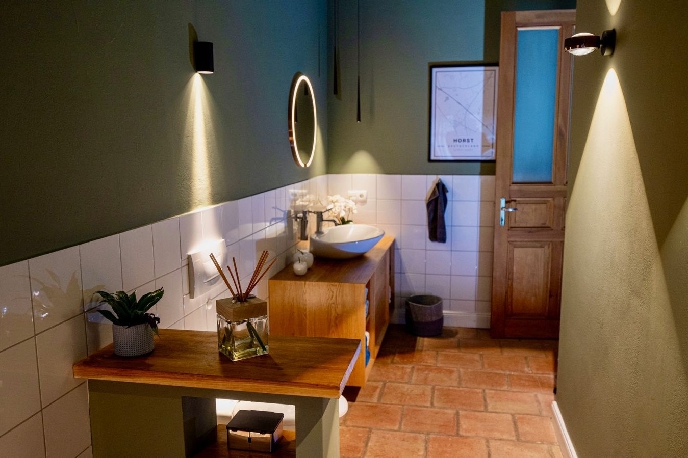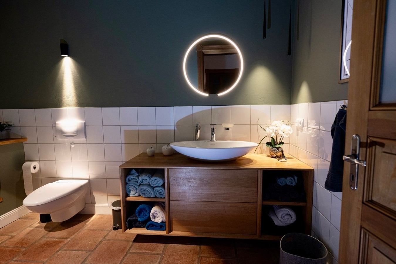 – modernes Duschbad sowie zusätzliches Vollbad mit Eckbadewanne, Holzwaschtisch und Occhio-Elementen