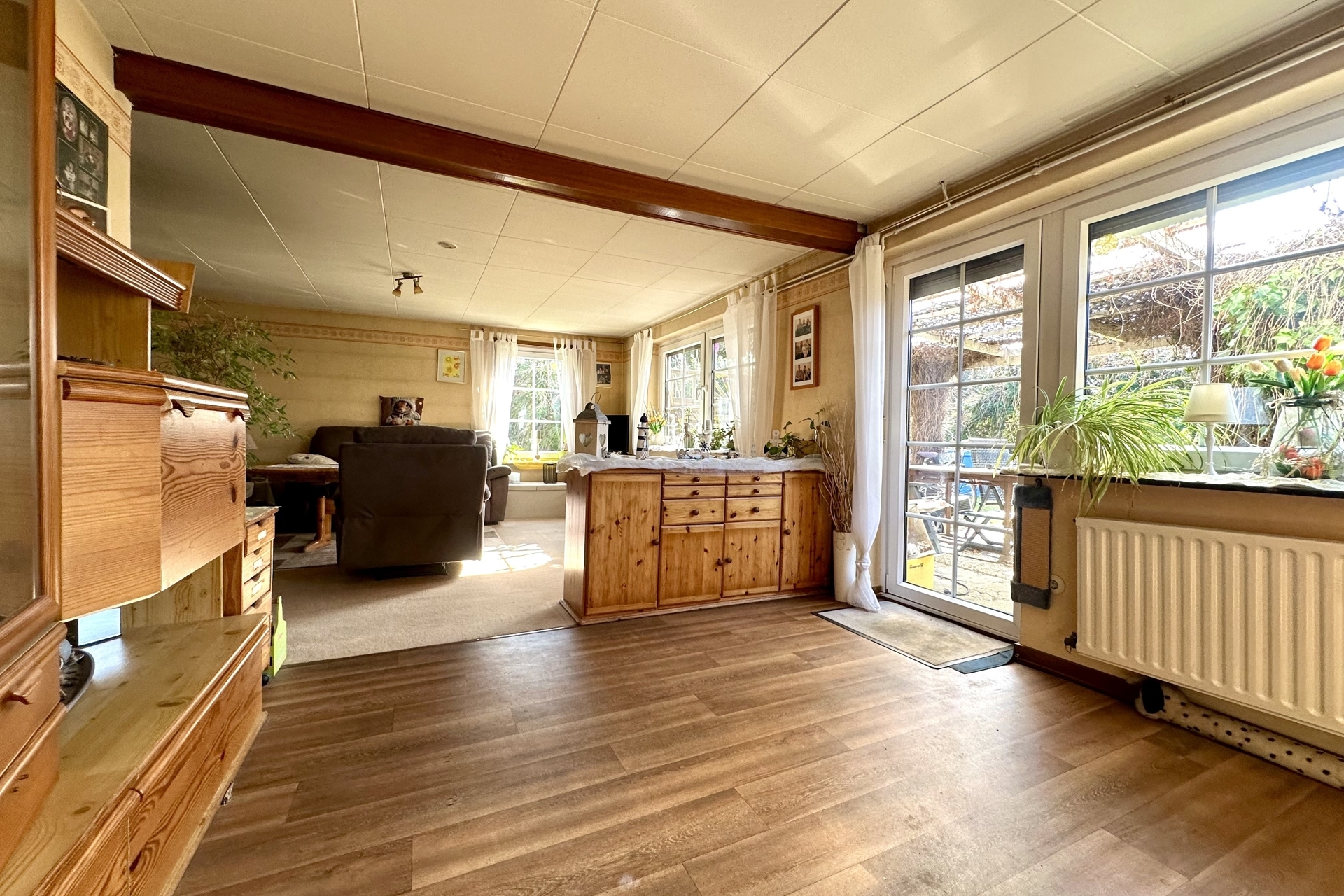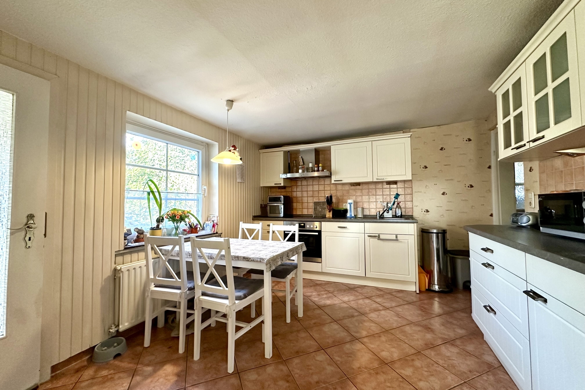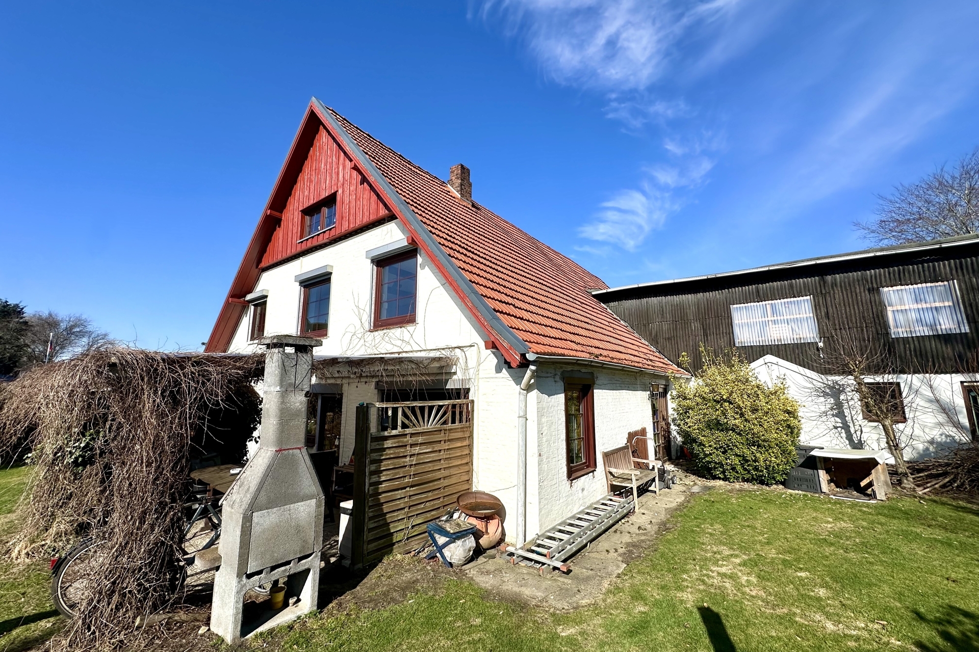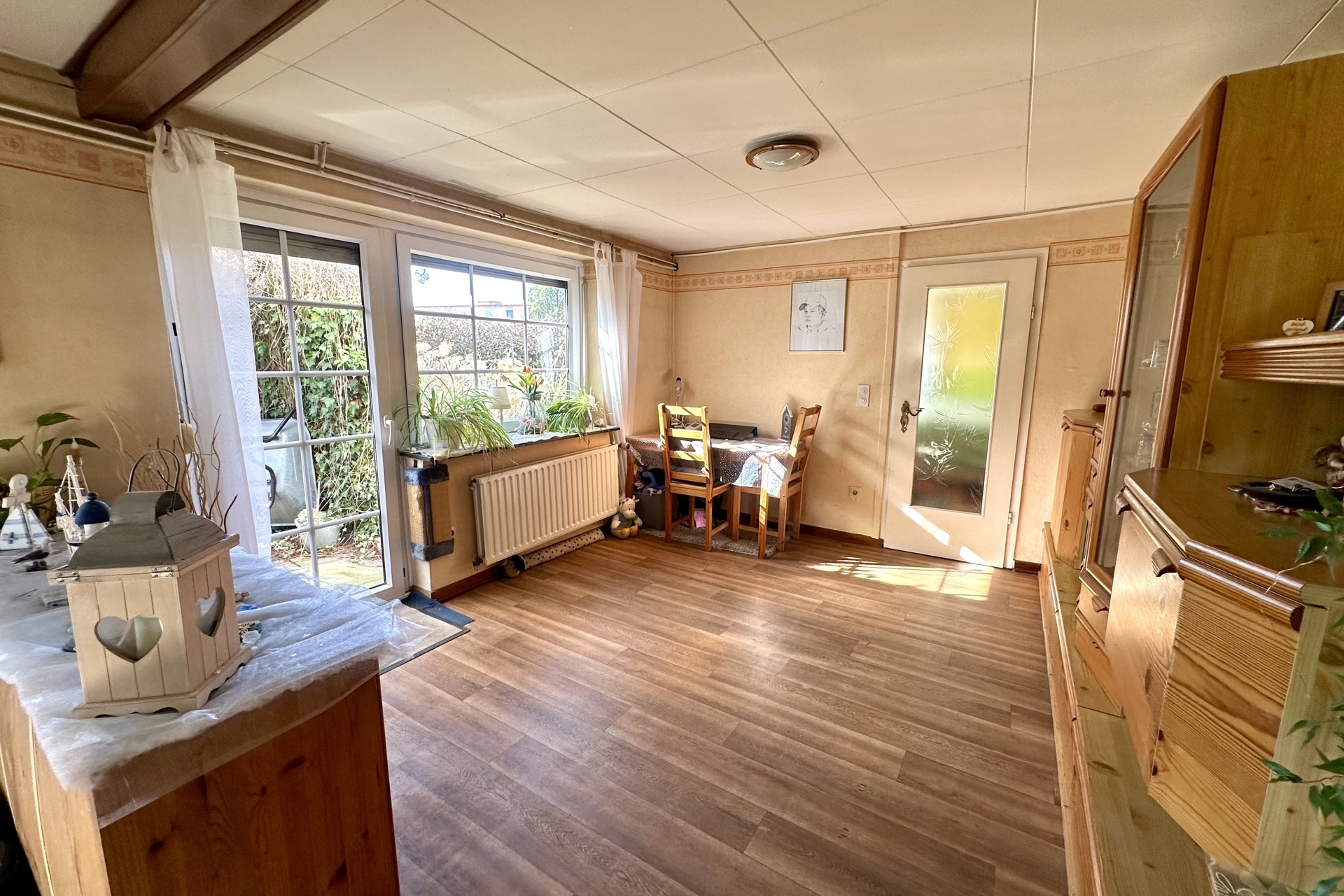 Der Wohnbereich im Erdgeschoss bietet eine gemütliche und funktionale Raumaufteilung. Hier erwarten Sie ein Wohn- und Essbereich mit einer Deckenhöhe von ca. 2,15 m, ein Schlafzimmer mit Platz für ein Doppelbett, eine Küche (modernisiert 2012), ein Badezimmer sowie ein zusätzlicher Raum, der sich ideal als Abstell- oder Vorratsraum nutzen lässt.